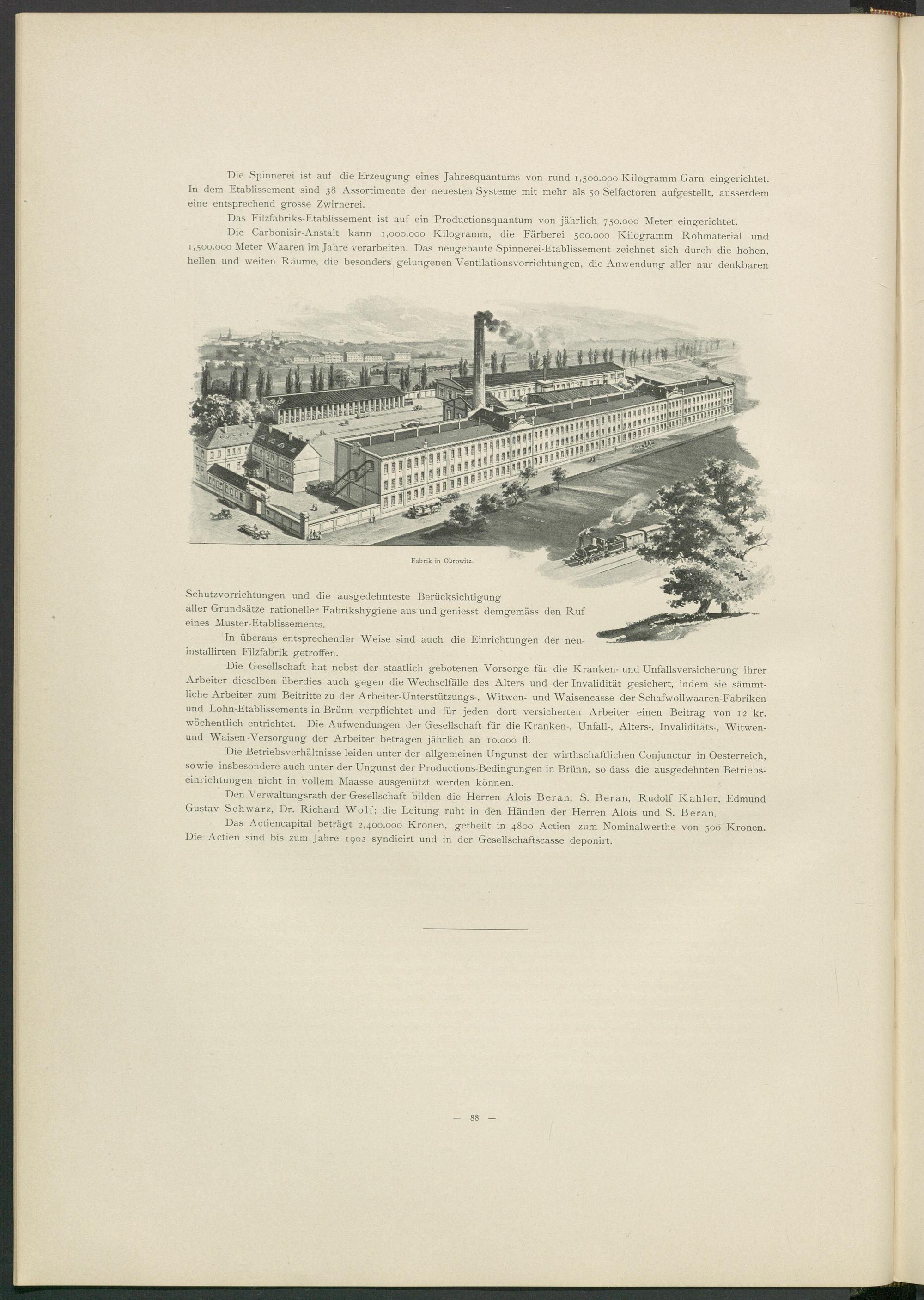 Den Verwaltungsrath der Gesellschaft bilden die Herren Alois Beran, S. Beran, Rudolf Kahler, Edmund Gustav Schwarz, Dr. Richard Wolf; die Leitung ruht in den Händen der Herren Alois und S. Beran.