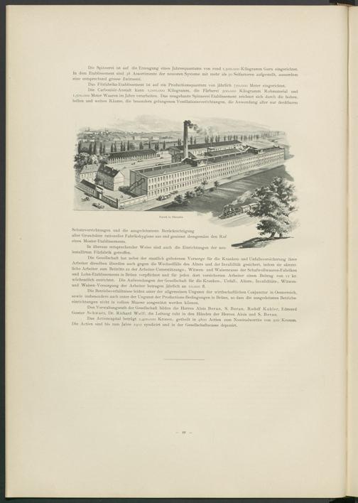 Die Gesellschaft hat nebst der staatlich gebotenen Vorsorge für die Kranken- und Unfallsversicherung ihrer Arbeiter dieselben überdies auch gegen die Wechselfälle des Alters und der Invalidität gesichert, indem sie sämmt- liche Arbeiter zum Beitritte zu der Arbeiter-Unterstützungs-, Witwen- und Waisencasse der Schafwollwaaren-Fabriken und Lohn-Etablissements in Brünn verpflichtet und für jeden dort versicherten Arbeiter einen Beitrag von 12 kr. wöchentlich entrichtet. Die Aufwendungen der Gesellschaft für die Kranken-, Unfall-, Alters-, Invaliditäts-, Witwen- und Waisen-Versorgung der Arbeiter betragen jährlich an 10.000 fl.