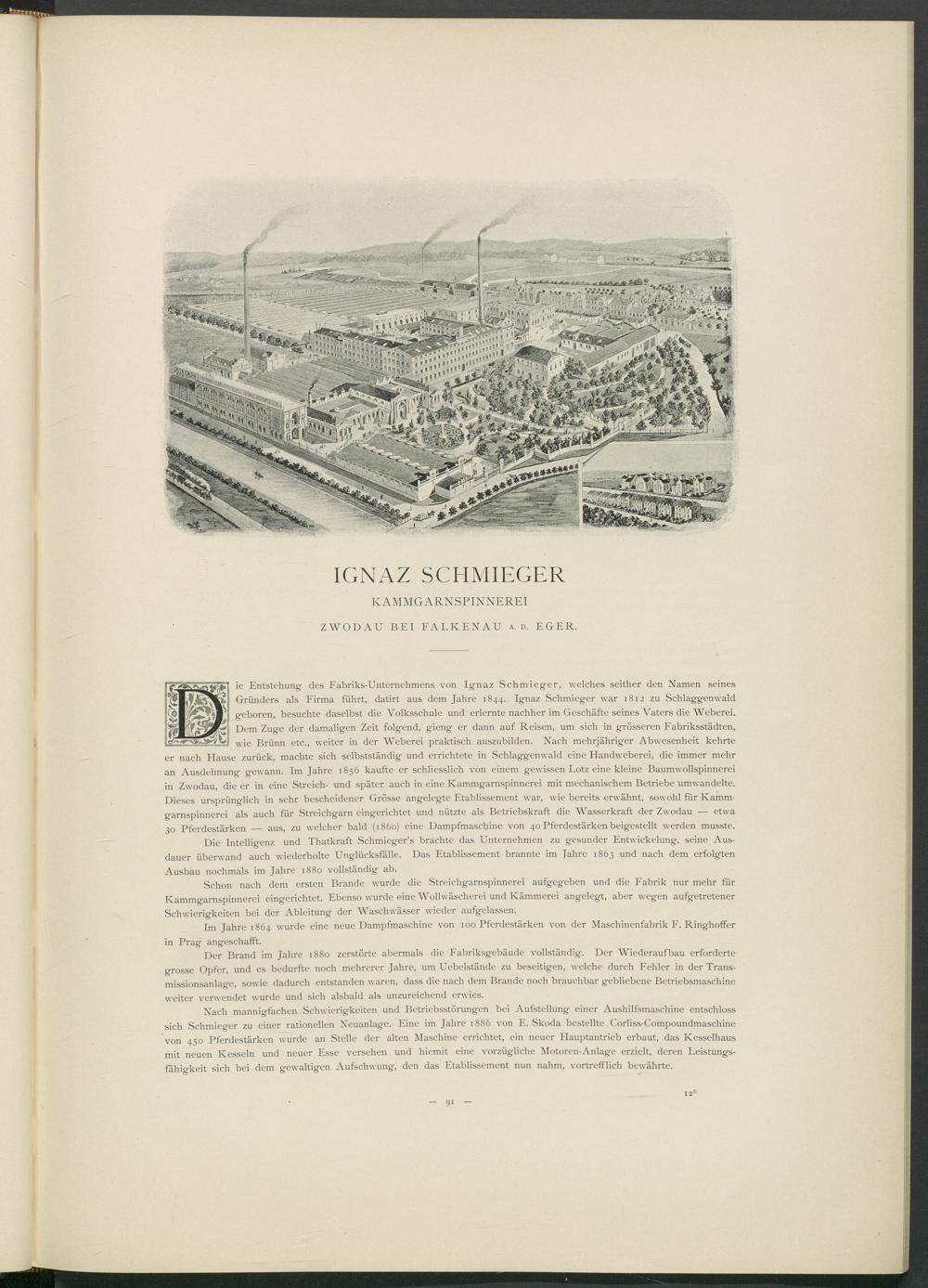 ie Entstehung - des Fabriks-Unternehmens von Ignaz Schmieger, welches seither den Namen seines Gründers als Firma führt, datirt aus dem Jahre 1844. Ignaz Schmieger war 1812 zu Schlaggenwald geboren, besuchte daselbst die Volksschule und erlernte nachher im Geschäfte seines Vaters die Weberei. Dem Zuge der damaligen Zeit folgend, gieng er dann auf Reisen, um sich in grösseren Fabriksstädten, wie Brünn etc., weiter in der Weberei praktisch auszubilden. Nach mehrjähriger Abwesenheit kehrte er nach Hause zurück, machte sich selbstständig und errichtete in Schlaggenwald eine Handweberei, die immer mehr an Ausdehnung gewann. Im Jahre 1856 kaufte er schliesslich von einem gewissen Lotz eine kleine Baumwollspinnerei in Zwodau, die er in eine Streich- und später auch in eine Kammgarnspinnerei mit mechanischem Betriebe umwandelte. Dieses ursprünglich in sehr bescheidener Grösse angelegte Etablissement war, wie bereits erwähnt, sowohl für Kammgarnspinnerei als auch für Streichgarn eingerichtet und nützte als Betriebskraft die Wasserkraft der Zwodau — etwa 30 Pferdestärken _ aus, zu welcher bald (1860) eine Dampfmaschine von 40 Pferdestärken beigestellt werden musste.