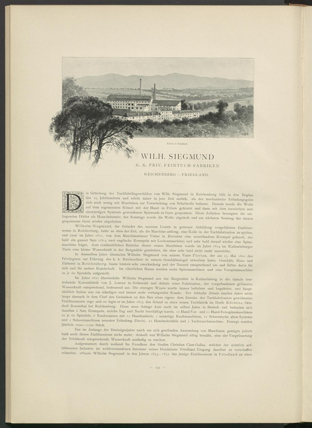 Aufgemuntert durch weiland Se. F.xcellenz den Grafen Christian Clam-Gallas, welcher der sichtlich aufblühenden Industrie im wohlverstandenen Interesse seines Dominiums P’riedland Eingang daselbst zu verschaffen wünschte, erbaute Wilhelm Siegmund in den Jahren 1833—1835 das jetzige Etablissement in Friedland an einer
