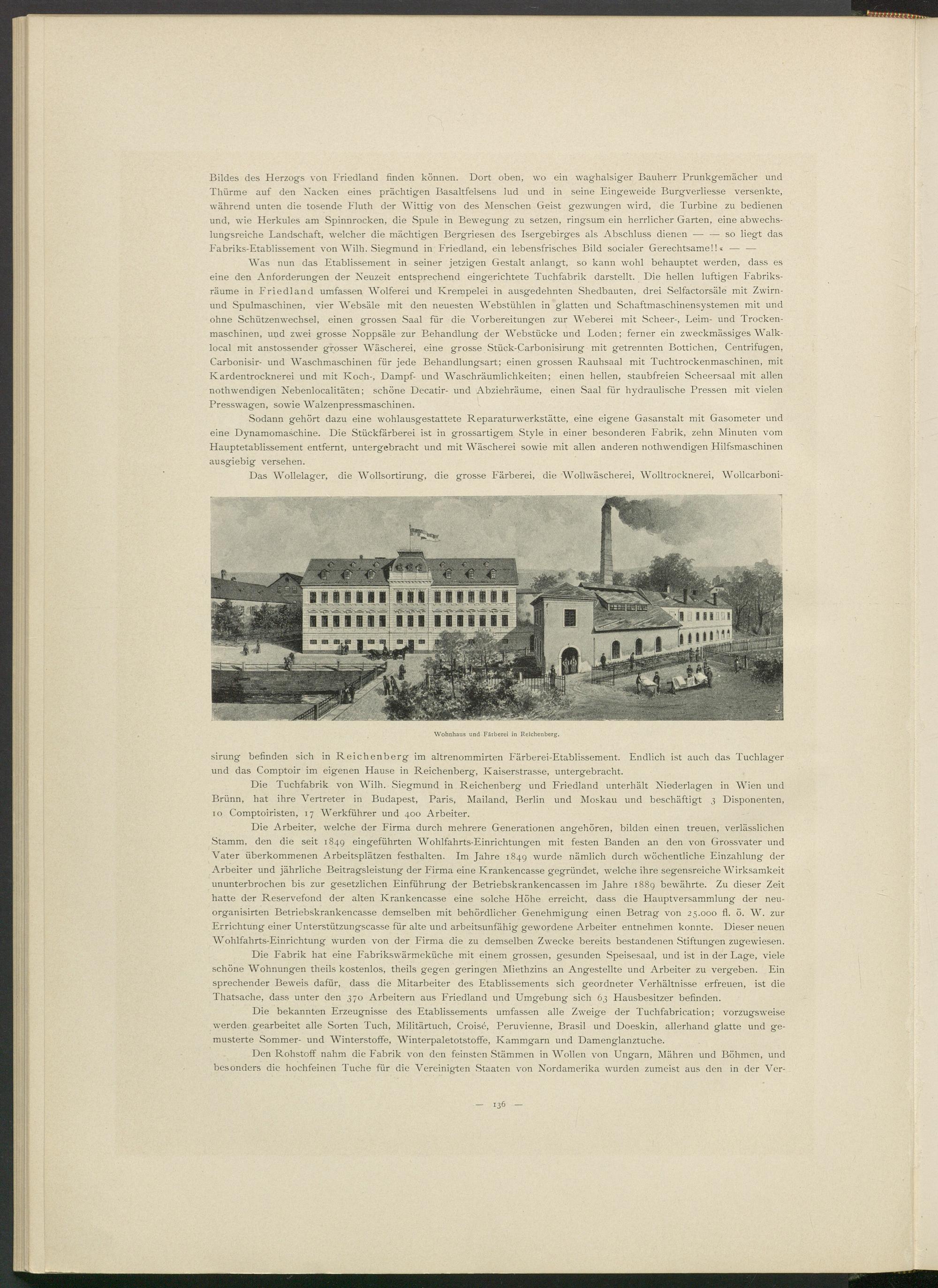 Die Tuchfabrik von Wilh. Siegmund in Reichenberg und Friedland unterhält Niederlagen in Wien und Brünn, hat ihre Vertreter in Budapest, Paris, Mailand, Berlin und Moskau und beschäftigt 3 Disponenten, 10 Comptoiristen, 17 Werkführer und 400 Arbeiter.