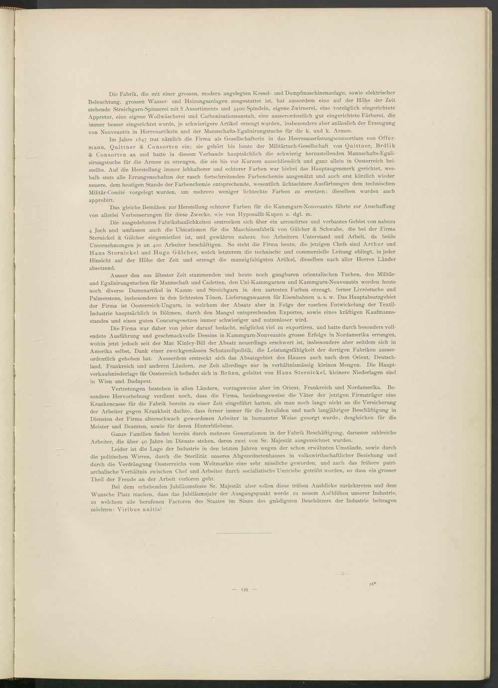 Bei dem erhebenden Jubiläumsfeste Sr. Majestät aber sollen diese trüben Ausblicke zurücktreten und dem Wunsche Platz machen, dass das Jubiläumsjahr der Ausgangspunkt werde zu neuem Aufblühen unserer Industrie, zu welchem alle berufenen Factoren des Staates im Sinne des gnädigsten Beschützers der Industrie beitragen möchten: Viribus unitis!
