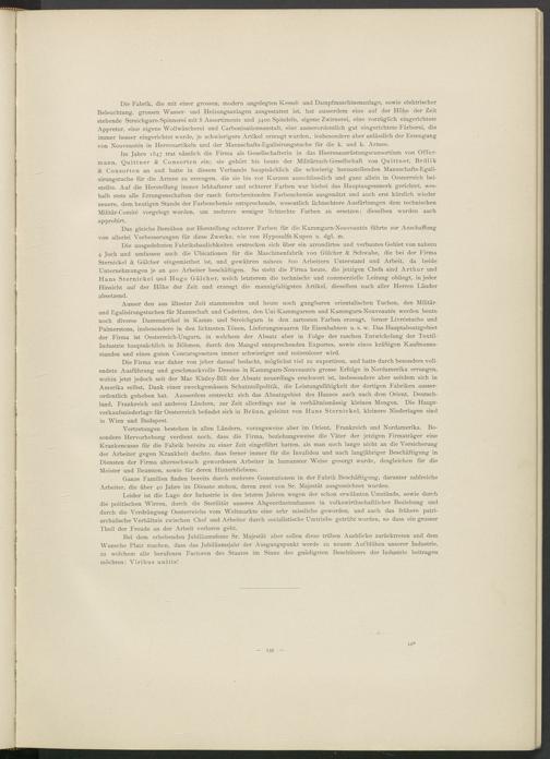Im Jahre 1847 trat nämlich die Firma als Gesellschafterin in das Heeresausrüstungsconsortium von Offer- mann, Quittner & Consorten ein; sie gehört bis heute der Militärtuch-Gesellschaft von Quittner, Brdlik & Consorten an und hatte in diesem Verbände hauptsächlich die schwierig herzustellenden Mannschafts-Egalisirungstuche für die Armee zu erzeugen, die sie bis vor Kurzem ausschliesslich und ganz allein in Oesterreich beistellte. Auf die Herstellung immer lebhafterer und echterer Farben war hiebei das Hauptaugenmerk gerichtet, weshalb stets alle Errungenschaften der rasch fortschreitenden Farbenchemie ausgenützt und auch erst kürzlich wieder neuere, dem heutigen Stande der Farbenchemie entsprechende, wesentlich lichtechtere Ausfärbungen dem technischen Militâr-Comité vorgelegt wurden, um mehrere weniger lichtechte Farben zu ersetzen ; dieselben wurden auch approbirt.