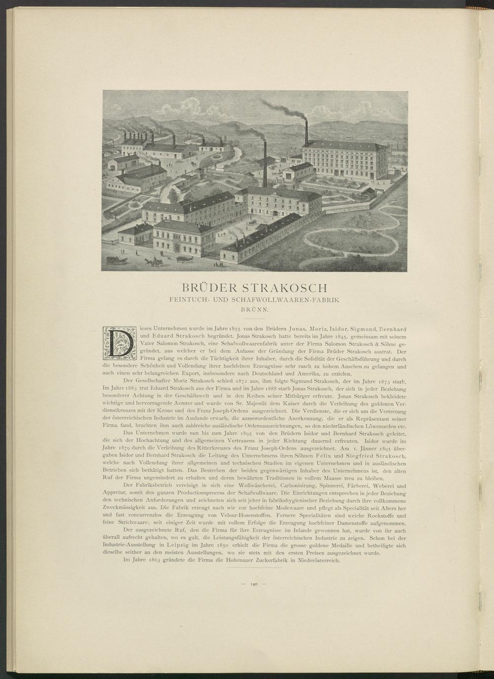 ieses Unternehmen wurde im Jahre 1855 von den Brüdern Jonas, Moriz, Isidor, Sigmund, Bernhard und Eduard Strakosch begründet. Jonas Strakosch hatte bereits im Jahre 1845, gemeinsam mit seinem Vater Salomon Strakosch, eine Schafwollwaarenfabrik unter der Firma Salomon Strakosch & Söhne gegründet, aus welcher er bei dem Anlasse der Gründung- der Firma Brüder Strakosch austrat. Der