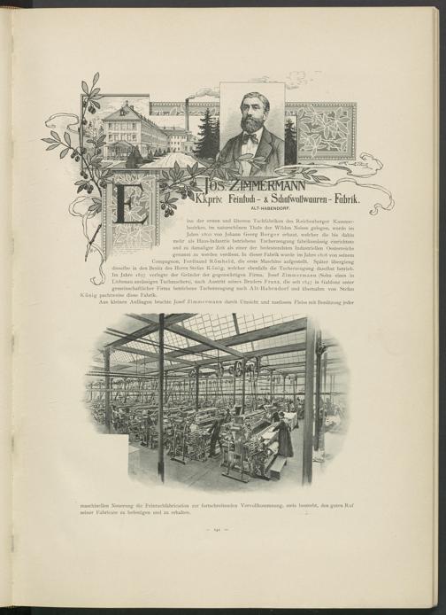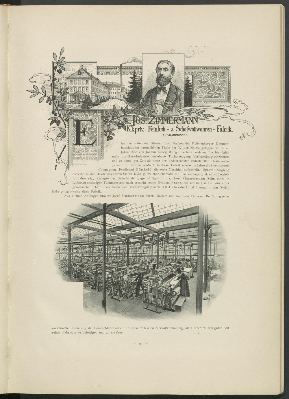 ine der ersten und ältesten Tuchfabriken des Reichenberger Kammerbezirkes, im naturschönen Thale der Wilden Neisse gelegen, wurde im Jahre 1800 von Johann Georg Berger erbaut, welcher die bis dahin mehr als Haus-Industrie betriebene Tucherzeugung fabriksmässig einrichtete und zu damaliger Zeit als einer der bedeutendsten Industriellen Oesterreichs genannt zu werden verdient. In dieser Fabrik wurde im Jahre 1808 von seinem Compagnon, Ferdinand Römheld, die erste Maschine aufgestellt. Später übergieng dieselbe in den Besitz des Herrn Stefan König, welcher ebenfalls die Tucherzeugung daselbst betrieb. Im Jahre 1857 verlegte der Gründer der gegenwärtigen Firma, Josef Zimmermann (Sohn eines in Liebenau ansässigen Tuchmachers), nach Austritt seines Bruders Franz, die seit 1847 in Gablonz unter gemeinschaftlicher Firma betriebene Tucherzeugung nach Alt-Habendorf und übernahm von Stefan pachtweise diese Fabrik.