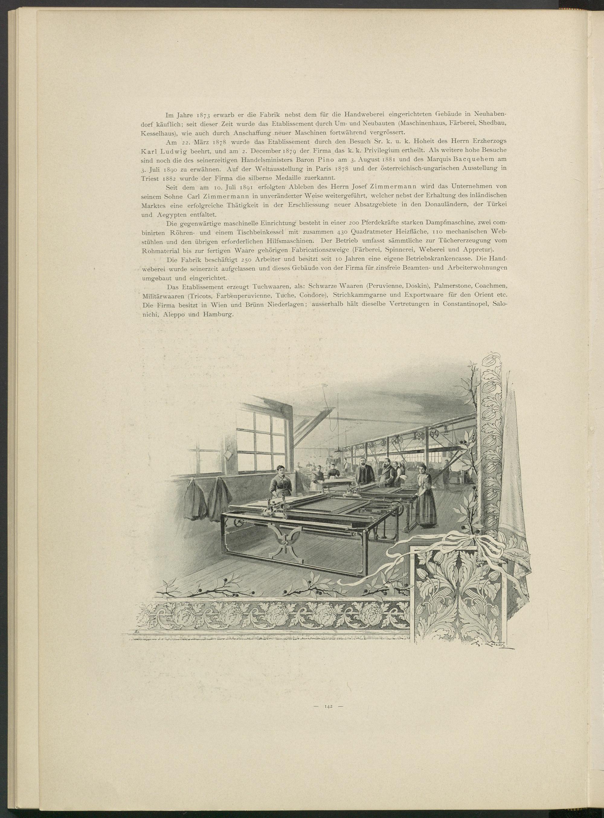 Das Etablissement erzeugt Tuchwaaren, als: Schwarze Waaren (Peruvienne, Doskin), Palmerstone, Coachmen, Militärwaaren (Tricots, Farbenperuvienne, Tuche, Condore), Strichkammgarne und Exportwaare für den Orient etc. Die Firma besitzt in Wien und Brünn Niederlagen; ausserhalb hält dieselbe Vertretungen in Constantinopel, Salo- nichi, Aleppo und Hamburg.