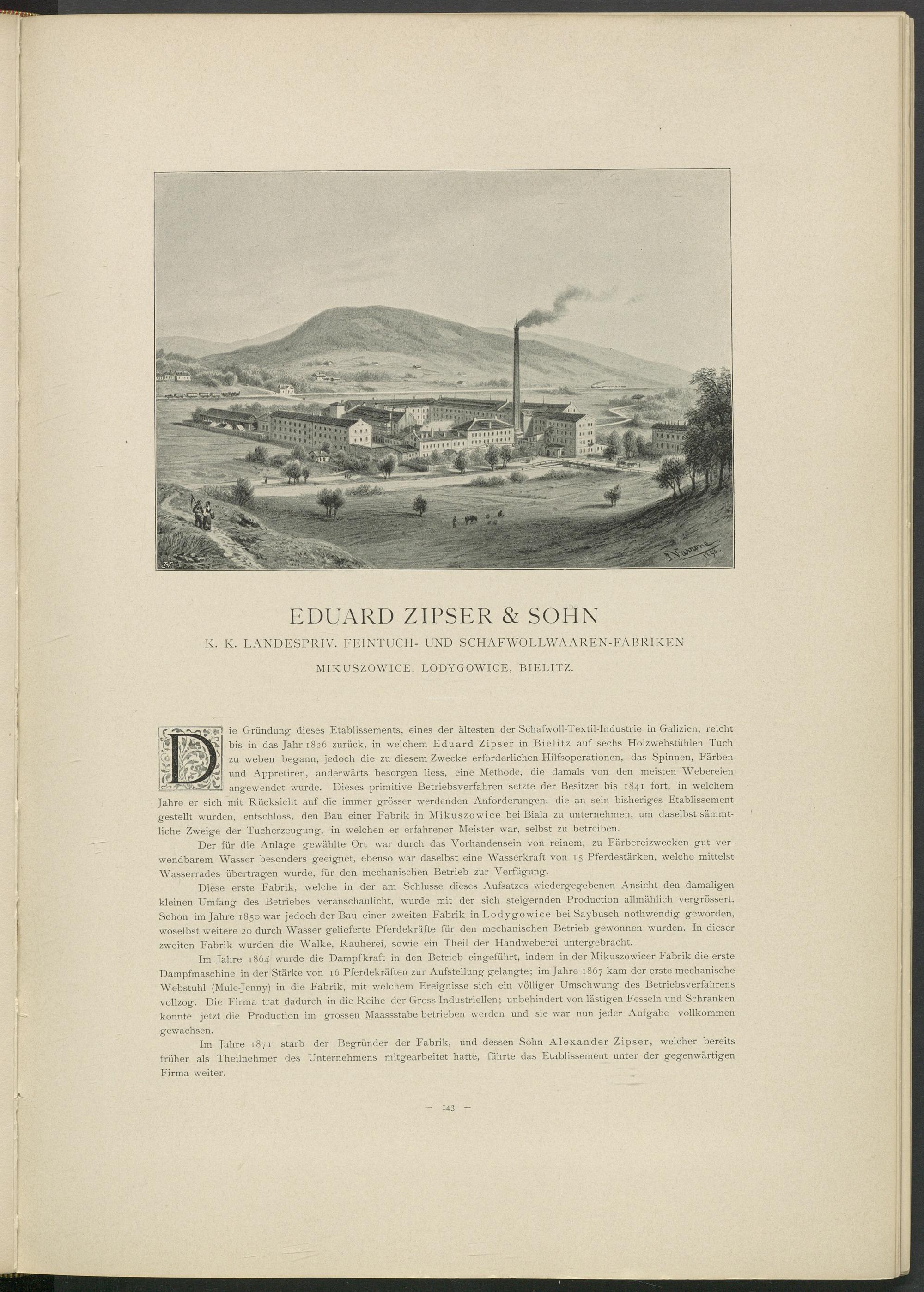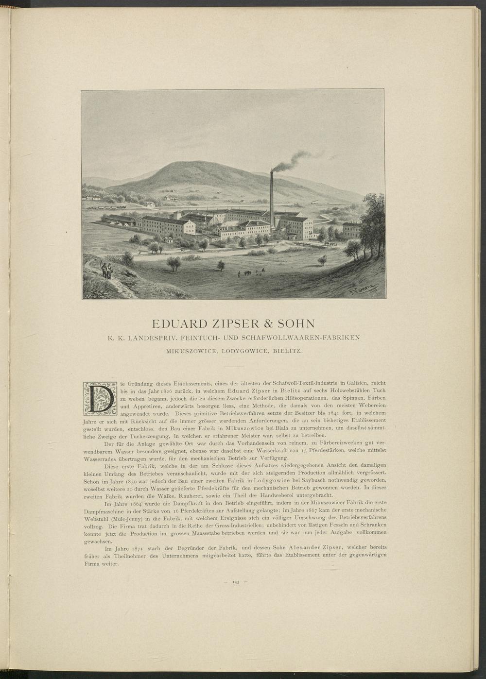 bis in das Jahr 1826 zurück, in welchem Eduard Zipser in Bielitz auf sechs Holzwebstühlen Tuch zu weben begann, jedoch die zu diesem Zwecke erforderlichen Hilfsoperationen, das Spinnen, Färben und Appretiren, anderwärts besorgen liess, eine Methode, die damals von den meisten Webereien