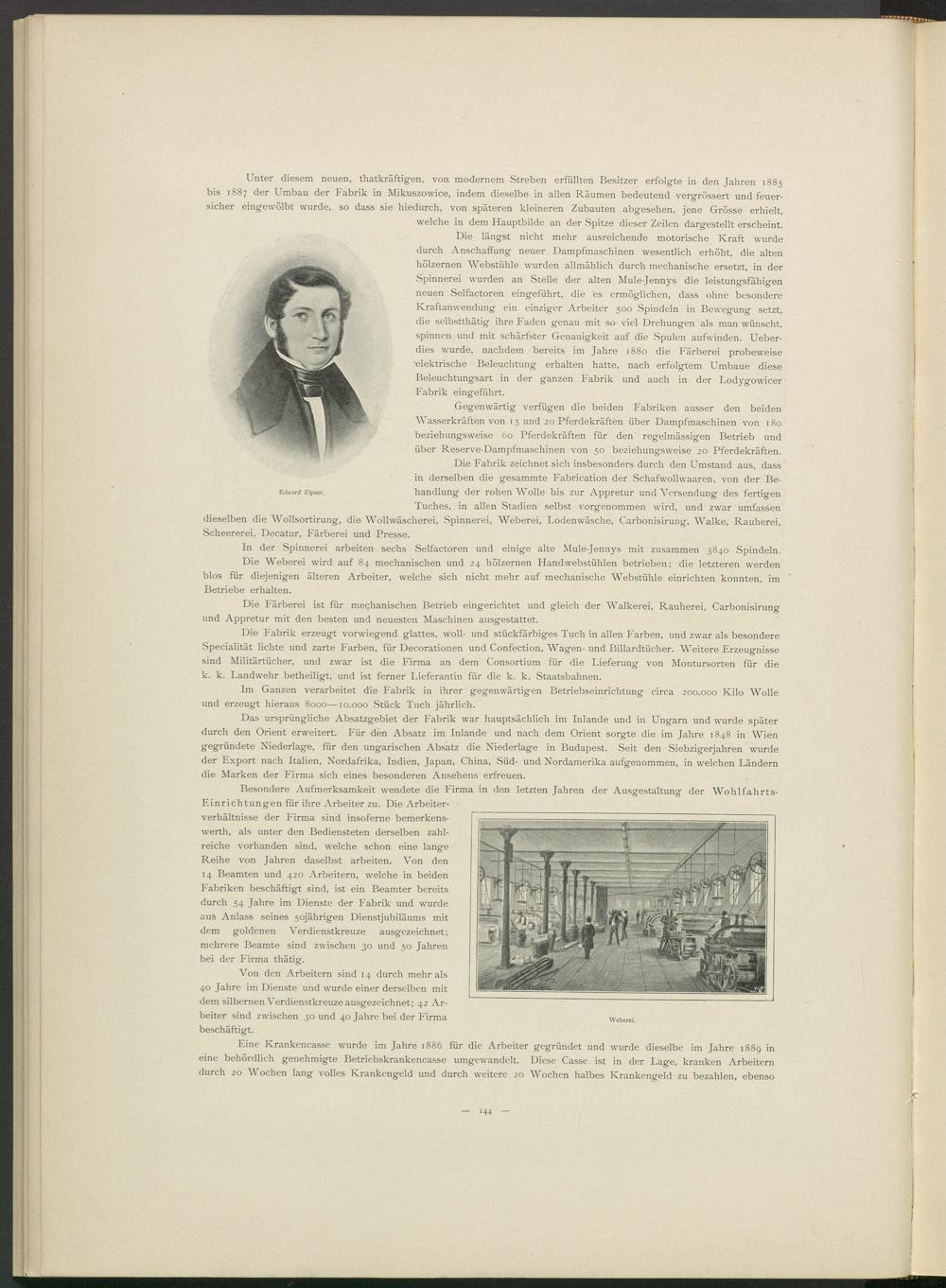 Die längst nicht mehr ausreichende motorische Kraft wurde durch Anschaffung neuer Dampfmaschinen wesentlich erhöht, die alten hölzernen Webstühle wurden allmählich durch mechanische ersetzt, in der Spinnerei wurden an Stelle der alten Mule-Jennys die leistungsfähigen neuen Selfactoren eingeführt, die es ermöglichen, dass ohne besondere Kraftanwendung ein einziger Arbeiter 500 Spindeln in Bewegung setzt, die selbstthätig ihre Faden genau mit so viel Drehungen als man wünscht, spinnen und mit schärfster Genauigkeit auf die Spulen aufwinden. Ueber- dies wurde, nachdem bereits im Jahre 1880 die Färberei probeweise •elektrische Beleuchtung erhalten hatte, nach erfolgtem Umbaue diese Beleuchtungsart in der ganzen Fabrik und auch in der Lodygowicer Fabrik eingeführt.