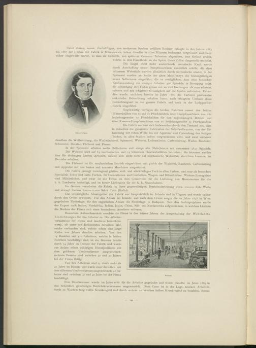 Besondere Aufmerksamkeit wendete die Firma in den letzten Jahren der Ausgestaltung der Wohlfahrts- Einrichtungen für ihre Arbeiter zu. Die Arbeiterverhältnisse der Firma sind insoferne bemerkens- werth, als unter den Bediensteten derselben zahlreiche vorhanden sind, welche schon eine lange Reihe von Jahren daselbst arbeiten. Von den 14 Beamten und 420 Arbeitern, welche in beiden Fabriken beschäftigt sind, ist ein Beamter bereits durch 54 Jahre im Dienste der Fabrik und wurde aus Anlass seines 50jährigen Dienstjubiläums mit dem goldenen Verdienstkreuze ausgezeichnet; mehrere Beamte sind zwischen 30 und 50 Jahren bei der Firma thätig.
