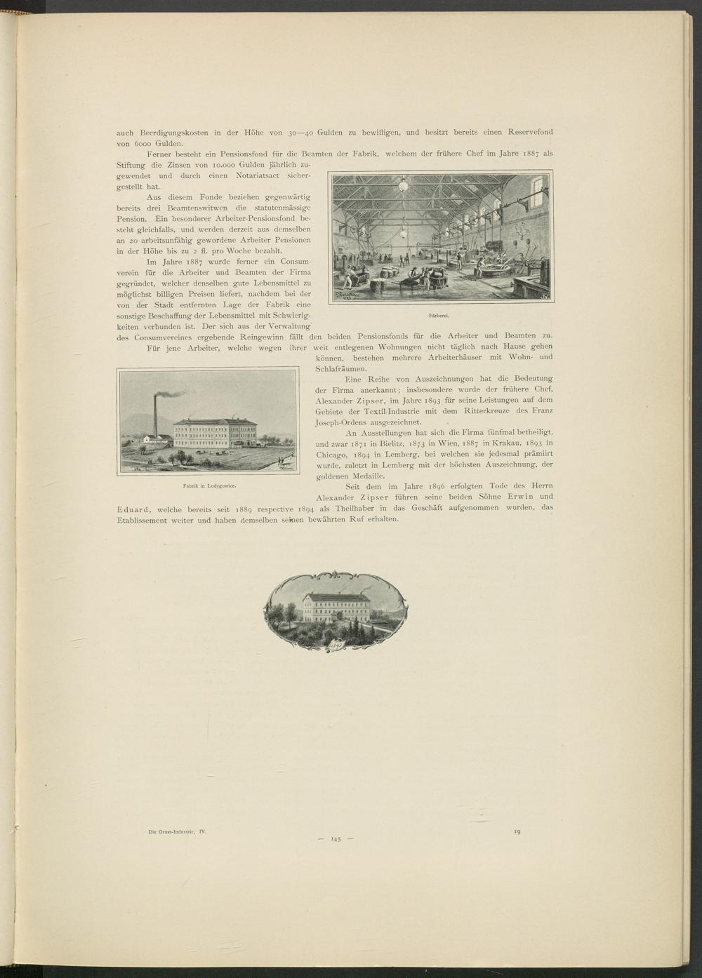 Eine Reihe von Auszeichnungen hat die Bedeutung der Firma anerkannt; insbesondere wurde der frühere Chef, Alexander Zipser, im Jahre 1893 für seine Leistungen auf dem Gebiete der Textil-Industrie mit dem Ritterkreuze des Franz Joseph-Ordens ausgezeichnet.