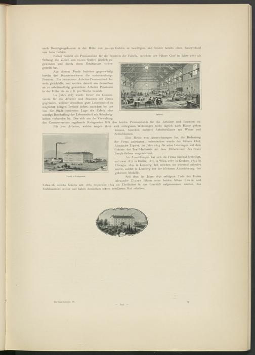 Ferner besteht ein Pensionsfond für die Beamten der Fabrik, welchem der frühere Chef im Jahre 1887 als Stiftung die Zinsen von 10.000 Gulden jährlich zugewendet und durch einen Notariatsact sichergestellt hat.