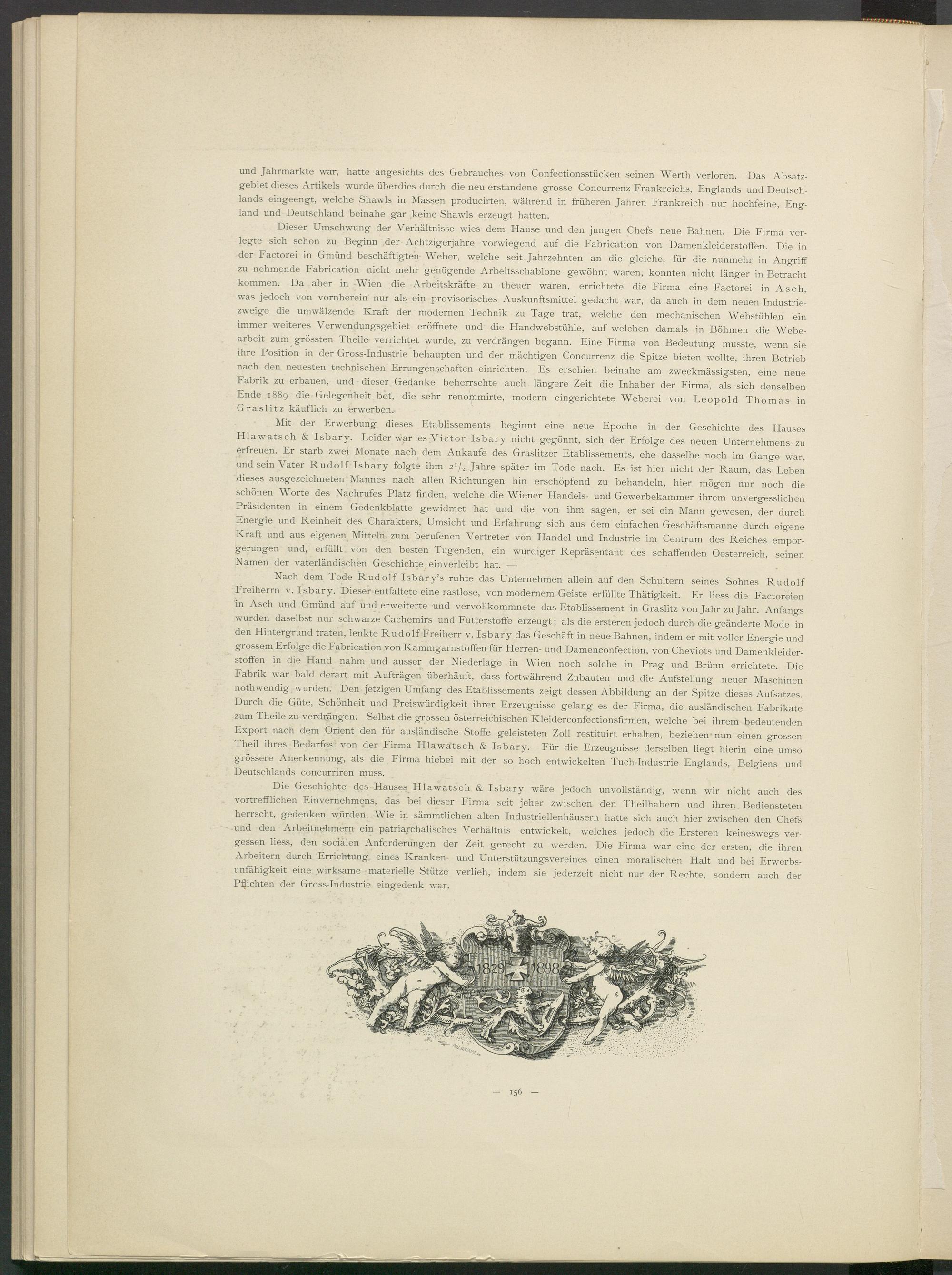 Mit der Erwerbung dieses Etablissements beginnt eine neue Epoche in der Geschichte des Hauses Hlawatsch & Isbary. Leider war esAUctor Isbary nicht gegönnt, sich der Erfolge des neuen Unternehmens zu erfreuen. Er starb zwei Monate nach dem Ankäufe des Graslitzer Etablissements, ehe dasselbe noch im Gange war, und sein A r ater Rudolf Isbary folgte ihm 2'/ 2 Jahre später im Tode nach. Es ist hier nicht der Raum, das Leben dieses ausgezeichneten Mannes nach allen Richtungen hin erschöpfend zu behandeln, hier mögen nur noch die schönen AAMrte des Nachrufes Platz finden, welche die AViener Handels- und Gewerbekammer ihrem unvergesslichen Präsidenten in einem Gedenkblatte gewidmet hat und die von ihm sagen, er sei ein Mann gewesen, der durch Energie und Reinheit des Charakters, Umsicht und Erfahrung sich aus dem einfachen Geschäftsmanne durch eigene Kraft und aus eigenen Mitteln zum berufenen A 7 ertreter von Handel und Industrie im Centrum des Reiches emporgerungen und, erfüllt von den besten Tugenden, ein würdiger Repräsentant des schaffenden Oesterreich, seinen Namen der vaterländischen Geschichte einverleibt hat. —