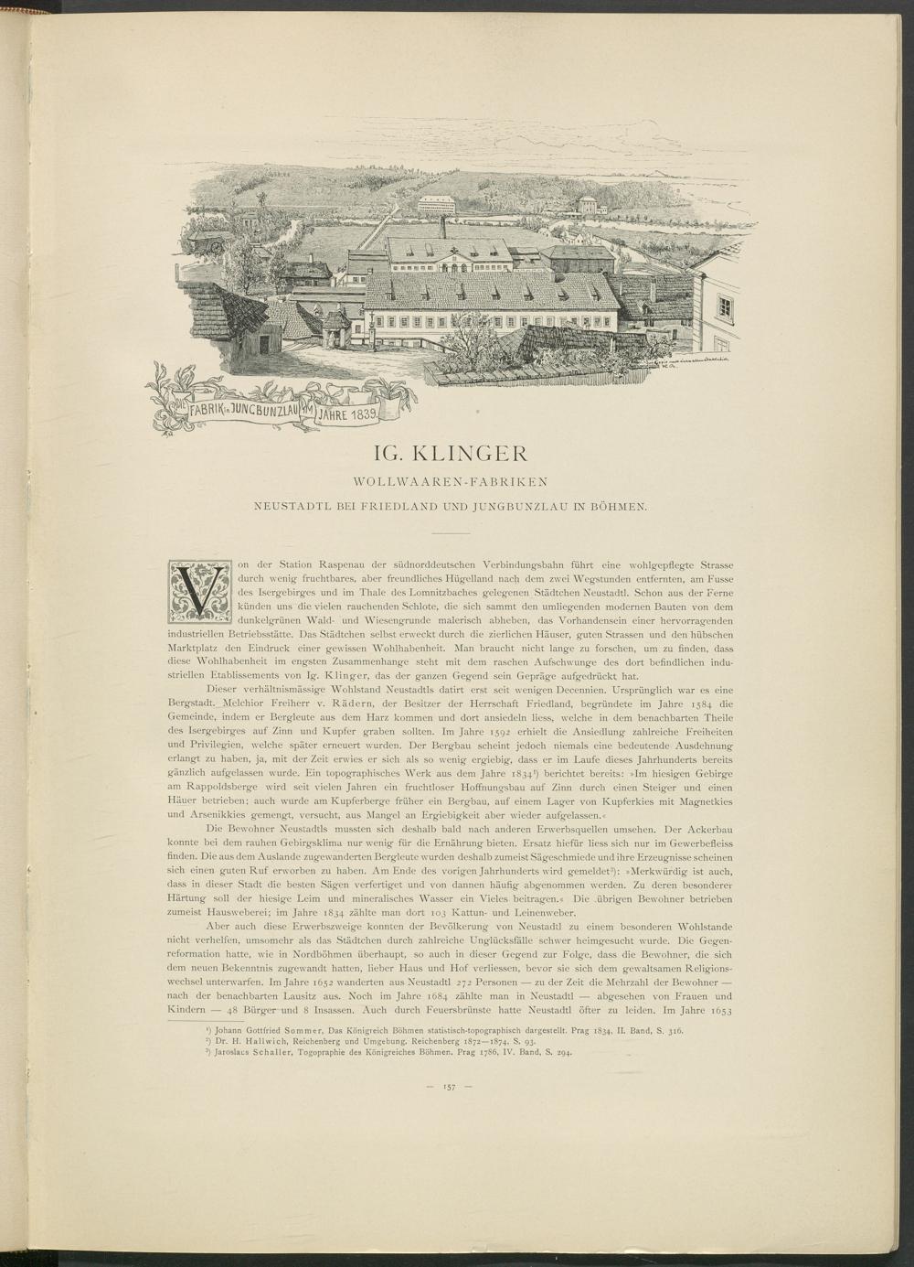 on der Station Raspenau der südnorddeutschen Verbindungsbahn führt eine wohlgepflegte Strasse durch wenig fruchtbares, aber freundliches Hügelland nach dem zwei Wegstunden entfernten, am Fusse des Isergebirges und im Thale des Lomnitzbaches gelegenen Städtchen Neustadtl. Schon aus der Ferne künden uns die vielen rauchenden Schlote, die sich sammt den umliegenden modernen Bauten von dem dunkelgrünen Wald- und Wiesengrunde malerisch abheben, das Vorhandensein einer hervorragenden industriellen Betriebsstätte. Das Städtchen selbst erweckt durch die zierlichen Häuser, guten Strassen und den hübschen Marktplatz den Eindruck einer gewissen Wohlhabenheit. Man braucht nicht lange zu forschen, um zu finden, dass diese Wohlhabenheit im engsten Zusammenhänge steht mit dem raschen Aufschwünge des dort befindlichen industriellen Etablissements von lg. Klinger, das der ganzen Gegend sein Gepräge aufgedrückt hat.