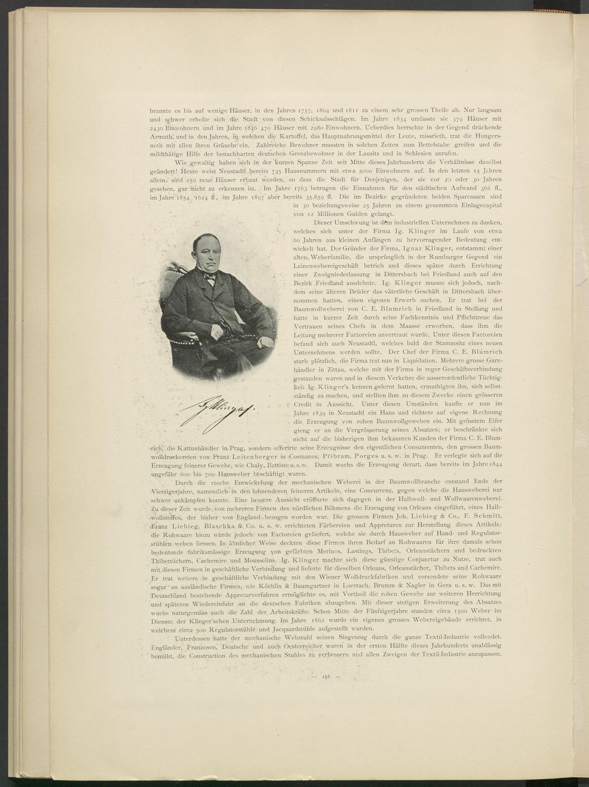Dieser Umschwung ist dem industriellen Unternehmen zu danken, welches sich unter der Firma lg. Klinger im Laufe von etwa 60 Jahren aus kleinen Anfängen zu hervorragender Bedeutung entwickelt hat. Der Gründer der Firma, Ignaz Klinger, entstammt einer alten Weberfamilie, die ursprünglich in der Rumburger Gegend ein Leinenwebereigeschäft betrieb und dieses später durch Errichtung einer Zweigniederlassung in Dittersbach bei Friedland auch auf den Bezirk Friedland ausdehnte. Ig. Klinger musste sich jedoch, nachdem seine älteren Brüder das väterliche Geschäft in Dittersbach übernommen hatten, einen eigenen Erwerb suchen. Er trat bei der Baumwollweberei von C. E. Blumrich in Friedland in Stellung und hatte in kurzer Zeit durch seine Fachkenntnis und Pflichttreue das Vertrauen seines Chefs in dem Maasse erworben, dass ihm die Leitung mehrerer Factoreien anvertraut wurde. Unter diesen Factoreien befand sich auch Neustadtl, welches bald der Stammsitz eines neuen Unternehmens werden sollte. Der Chef der Firma C. E. Blumrich starb plötzlich, die Firma trat nun in Liquidation. Mehrere grosse Garnhändler in Zittau, welche mit der Firma in reger Geschäftsverbindung gestanden waren und in diesem Verkehre die ausserordentliche Tüchtigkeit Ig. Klinger’s kennen gelernt hatten, ermuthigten ihn, sich selbstständig zu machen, und stellten ihm zu diesem Zwecke einen grösseren Credit in Aussicht. Unter diesen Umständen kaufte er nun im Jahre 1839 i n Neustadtl ein Haus und richtete auf eigene Rechnung die Erzeugung von rohen Baumwollgeweben ein. Mit grösstem Eifer gieng er an die Vergrösserung seines Absatzes; er beschränkte sich nicht auf die bisherigen ihm bekannten Kunden der Firma C. E. Blum- •rich, die Kattunhändler in Prag, sondern offerirte seine Erzeugnisse den eigentlichen Consumenten, den grossen Baum- wolldruckereien von Franz Leitenberger in -Cosmanos, Pfibram, Porges u. s. w. in Prag. Er verlegte sich auf die Erzeugung feinerer Gewebe, wie Chaly, Battiste u. s.w. Damit wuchs die Erzeugung derart, dass bereits im Jahre 1844 ungefähr 600 bis 700 Hausweber beschäftigt .waren.