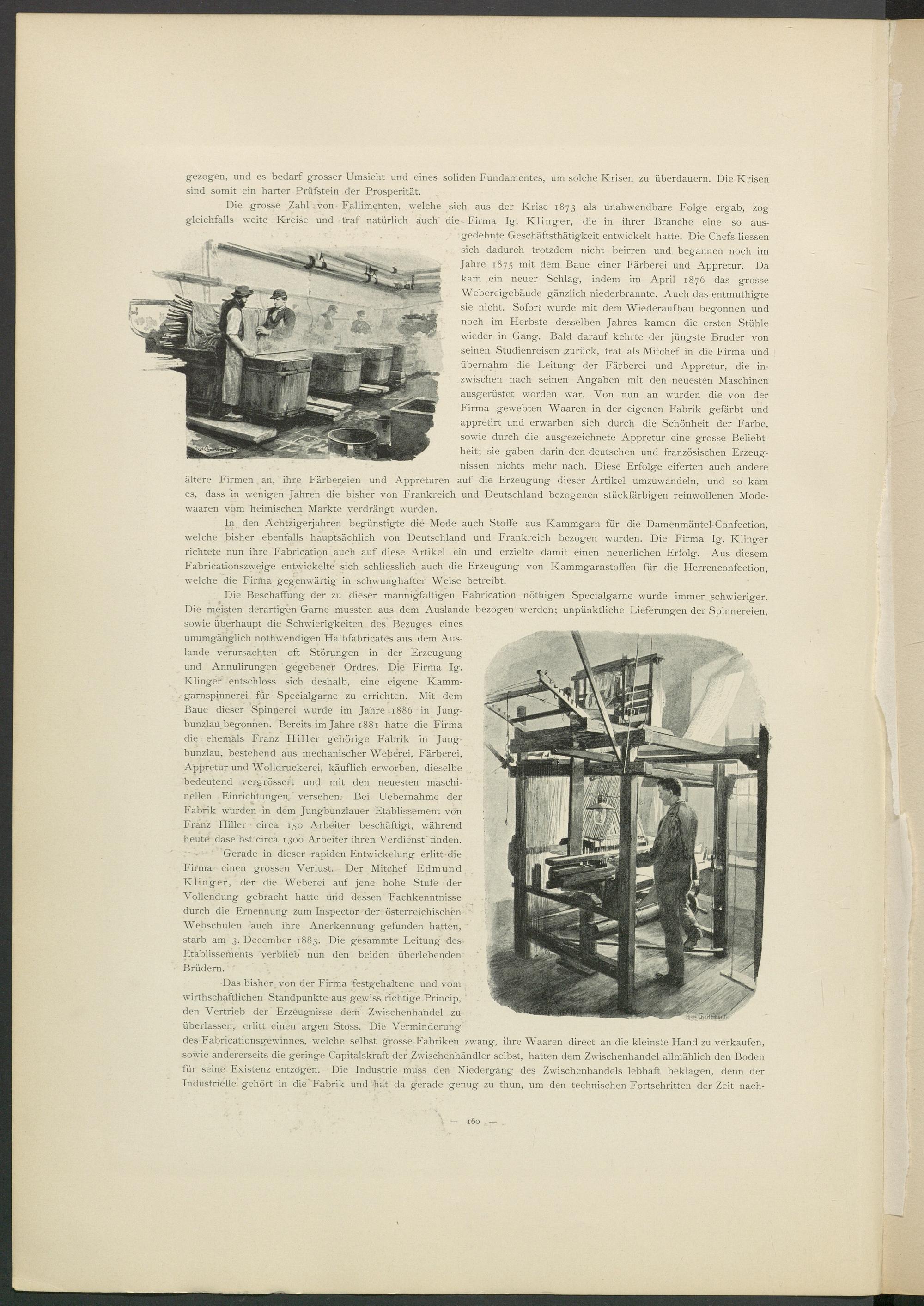 Die grosse Zahl .von Fallimenten, welche sich aus der Krise 1873 als unabwendbare Folge ergab, zog gleichfalls weite Kreise und traf natürlich auch die Firma lg. Klinger, die in ihrer Branche eine so ausgedehnte Geschäftsthätigkeit entwickelt hatte. Die Chefs Hessen sich dadurch trotzdem nicht beirren und begannen noch im Jahre 1875 mit dem Baue einer Färberei und Appretur. Da kam ein neuer Schlag, indem im April 1876 das grosse Webereigebäude gänzlich niederbrannte. Auch das entmuthigte sie nicht. Sofort wurde mit dem Wiederaufbau begonnen und noch im Herbste desselben Jahres kamen die ersten Stühle wieder in Gang. Bald darauf kehrte der jüngste Bruder von seinen Studienreisen zurück, trat als Mitchef in die Firma und übernahm die Leitung der Färberei und Appretur, die inzwischen nach seinen Angaben mit den neuesten Maschinen ausgerüstet worden war. Von nun an wurden die von der Firma gewebten Waaren in der eigenen Fabrik gefärbt und appretirt und erwarben sich durch die Schönheit der Farbe, sowie durch die ausgezeichnete Appretur eine grosse Beliebtheit; sie gaben darin den deutschen und französischen Erzeugnissen nichts mehr nach. Diese Erfolge eiferten auch andere ältere Firmen an, ihre Färbereien und Appreturen auf die Erzeugung dieser Artikel umzuwandeln, und so kam es, dass in wenigen Jahren die bisher von Frankreich und Deutschland bezogenen stückfärbigen reinwollenen Mode- waaren vom heimischen Markte verdrängt wurden.