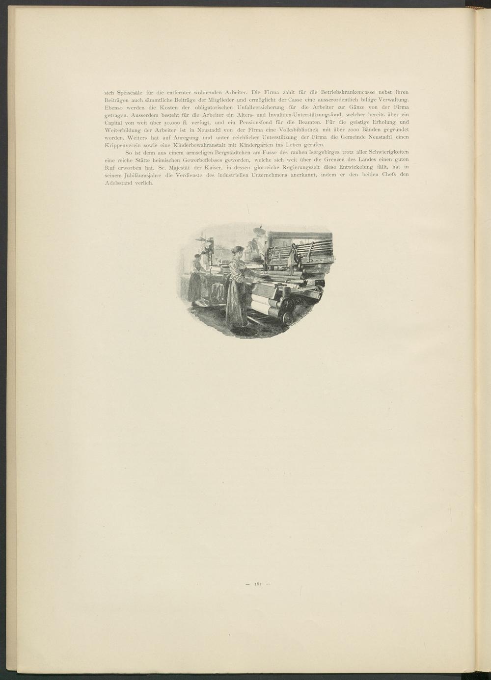 sich Speisesäle für die entfernter wohnenden Arbeiter. Die Firma zahlt für die Betriebskrankencasse nebst ihren Beiträgen auch sämmtliche Beiträge der Mitglieder und ermöglicht der Casse eine ausserordentlich billige Verwaltung. Ebenso werden die Kosten der obligatorischen Unfallversicherung für die Arbeiter zur Gänze von der Firma getragen. Ausserdem besteht für die Arbeiter ein Alters- und Invaliden-Unterstützungsfond, welcher bereits über ein Capital von weit über 50.000 fl. verfügt, und ein Pensionsfond für die Beamten. Für die geistige Erholung und Weiterbildung der Arbeiter ist in Neustadtl von der Firma eine Volksbibliothek mit über 2000 Bänden gegründet worden. Weiters hat auf Anregung und unter reichlicher Unterstützung der Firma die Gemeinde Neustadtl einen Krippenverein sowie eine Kinderbewahranstalt mit Kinderg-arten ins Leben gerufen.