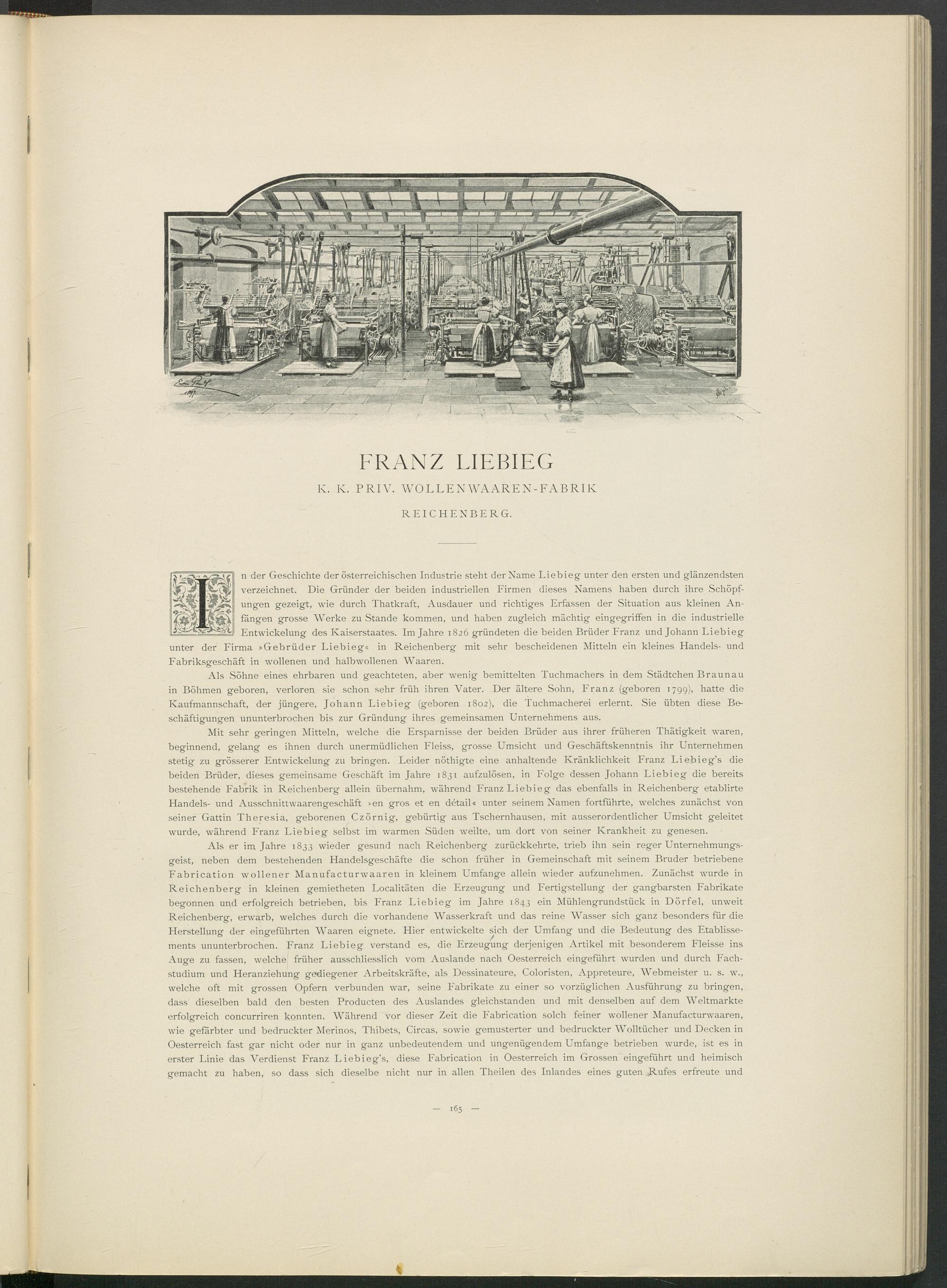 n der Geschichte der österreichischen Industrie steht der Name Liebieg unter den ersten und glänzendsten verzeichnet. Die Gründer der beiden industriellen Firmen dieses Namens haben durch ihre Schöpfungen gezeigt, wie durch Thatkraft, Ausdauer und richtiges Erfassen der Situation aus kleinen Anfängen grosse Werke zu Stande kommen, und haben zugleich mächtig eingegriffen in die industrielle Entwickelung des Kaiserstaates. Im Jahre 1826 gründeten die beiden Brüder Franz und Johann Liebieg unter der Firma »Gebrüder Liebieg« in Reichenberg mit sehr bescheidenen Mitteln ein kleines Handels- und Fabrikseeschäft in wollenen und halbwollenen Waaren.