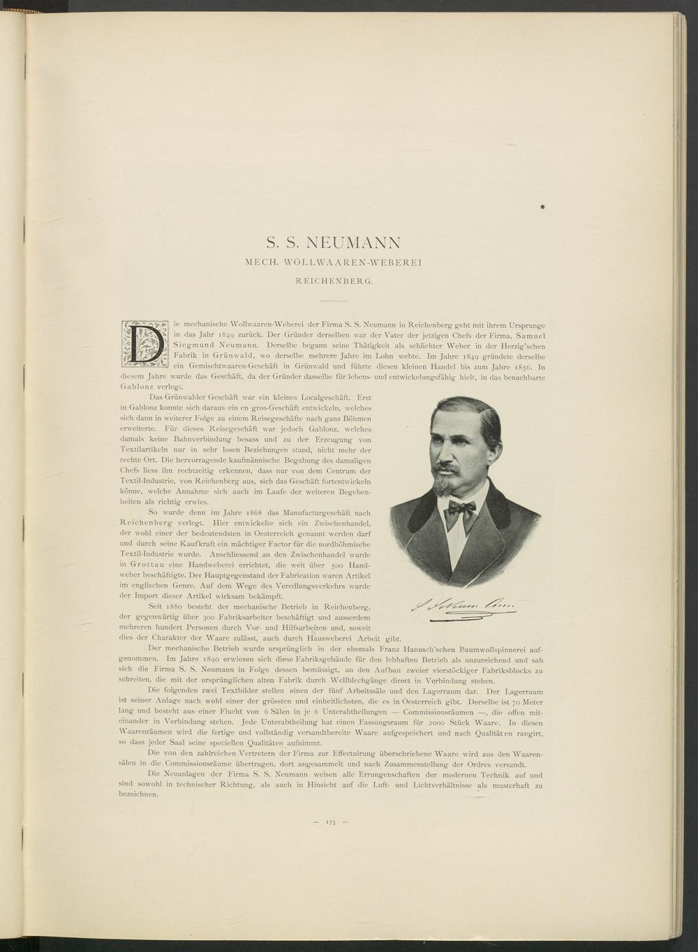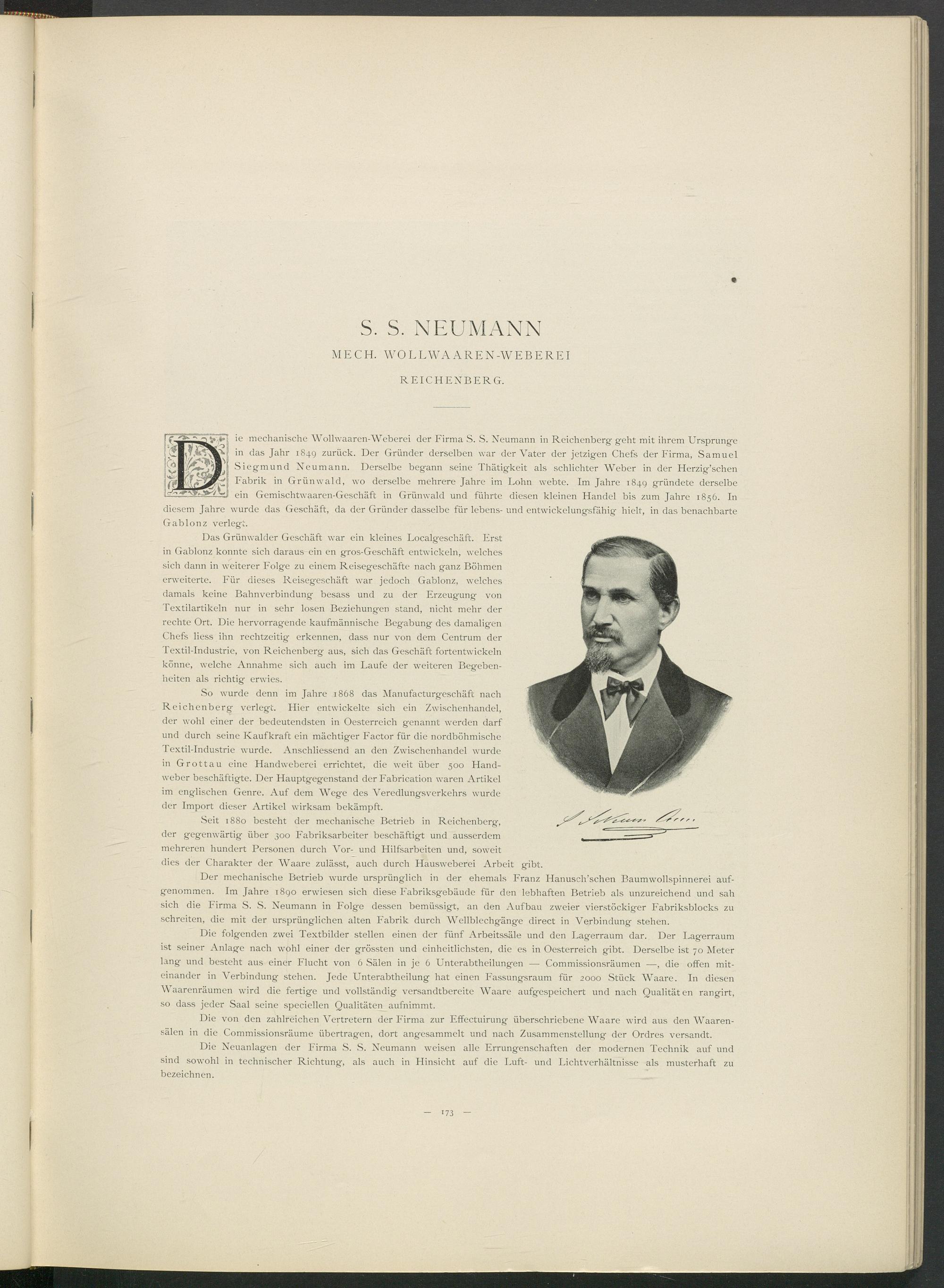 ie mechanische Wollwaaren-Weberei der Firma S. S. Neumann in Reichenberg geht mit ihrem Ursprünge in das Jahr 1849 zurück. Der Gründer derselben war der Vater der jetzigen Chefs der Firma, Samuel Siegmund Neumann. Derselbe begann seine Thätigkeit als schlichter Weber in der Herzig’schen Fabrik in Grünwald, wo derselbe mehrere Jahre im Lohn webte. Im Jahre 1849 gründete derselbe ein Gemischtwaaren-Geschäft in Grünwald und führte diesen kleinen Handel bis zum Jahre 1856. In diesem Jahre wurde das Geschäft, da der Gründer dasselbe für lebens- und entwickelungsfähig hielt, in das benachbarte Gablonz verlegt.