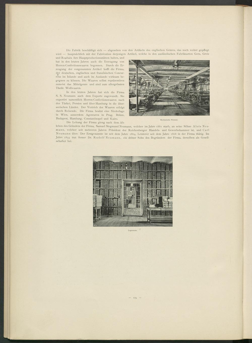 i starb, an seine Söhne Alois Neu- und Gewerbekammer ist, und Carl Neumann über. Der Erstgenannte ist seit dem Jahre 1864, Letzterer seit dem Jahre 1868 in der Firma thätig. Im Jahre 1894 trat ferner Dr. Rudolf Neumann, ein dritter Sohn des Begründers der Firma, derselben als Gesellschafter bei.