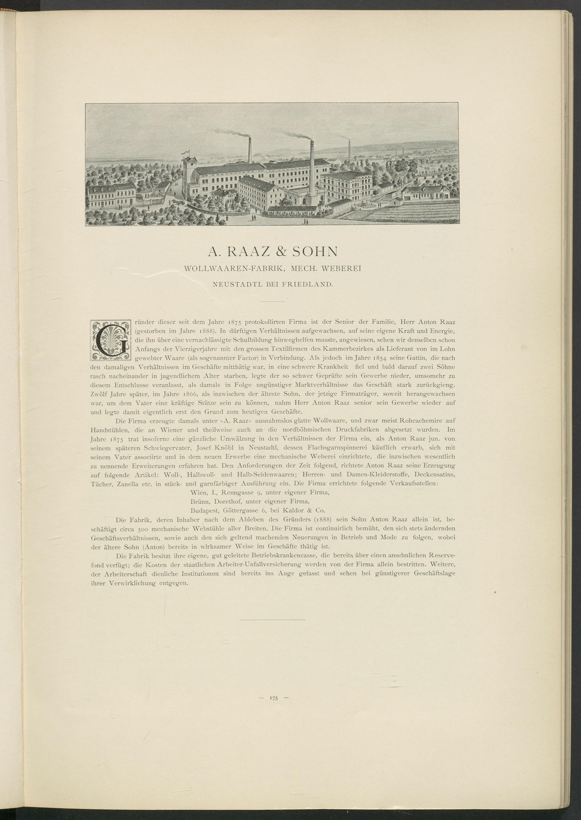 ründer dieser seit dem Jahre 1875 protokollirten Firma ist der Senior der Familie, Herr Anton Raaz (gestorben im Jahre 1888). In dürftigen Verhältnissen auf gewachsen, auf seine eigene Kraft und Energie, die ihn über eine vernachlässigte Schulbildung hinweghelfen musste, angewiesen, sehen wir denselben schon Anfanges der Aherzigerjahre mit den grossen Textilfirmen des Kammerbezirkes als Lieferant von im Lohn gewebter Waare (als sogenannter Factor) in Verbindung. Als jedoch im Jahre 1854 seine Gattin, die nach den damaligen Verhältnissen im Geschäfte mitthätig war, in eine schwere Krankheit fiel und bald darauf zwei Söhne rasch nacheinander in jugendlichem Alter starben, legte der so schwer Geprüfte sein Gewerbe nieder, umsomehr zu diesem Entschlüsse veranlasst, als damals in Folge ungünstiger Marktverhältnisse das Geschäft stark zurückgieng. Zwölf Jahre später, im Jahre 1866, als inzwischen der älteste Sohn, der jetzige Firmaträger, soweit herangewachsen war, um dem A'ater eine kräftige Stütze sein zu können, nahm Herr Anton Raaz senior sein Gewerbe wieder auf und legte damit eigentlich erst den Grund zum heutigen Geschäfte.