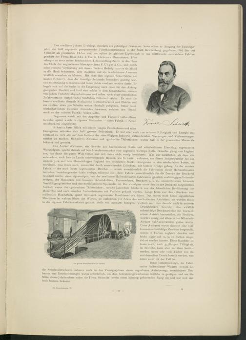 Der Artikel »Orleans«, ein Gewebe aus baumwollener Kette und schafwollenem Einschlag, sogenanntes Worstedgarn, spielte damals auf dem Manufacturmarkte eine ungemein wichtige Rolle. Derselbe gieng von England aus, das damit die ganze Welt versah und sich daran nicht wenig bereicherte. Was war natürlicher, als dass, wie anderwärts, auch hier zu Lande unternehmende Männer, wie Schmitt, auftraten, um diesen Industriezweig bei uns einzubürgern und dem übermächtigen England den heimischen Markt, wenigstens in den minderfeinen Sorten, zu entreissen, was ihnen auch, unterstützt durch ausreichenden Zollschutz, mit bestem Erfolge gelang. In der unteren Fabrik — der noch heute sogenannten »Bleiche« — wurde ausschliesslich die Fabrication dieser Halbwollwaaren betrieben, beziehungsweise dahin verlegt, während die »obere Fabrik« ausschliesslich für die Zwecke der Druckerei bestimmt wurde, eines eigenartigen, von der erwähnten Halbwollwaaren-Fabrication gänzlich unabhängigen Industriezweiges, der Hunderten von besseren Arbeitskräften, Formstechern, Druckern u. s. w., ununterbrochen lohnende Beschäftigung brachte und eine nordböhmische Specialität ist. Der wichtigste unter den in der Druckerei hergestellten Artikeln waren die »gedruckten Thibettücher«, welche Jahrzehnte hindurch von der bäuerlichen Bevölkerung der Monarchie und auch mancher Auslandsstaaten mit Vorliebe gekauft wurden. Lange Jahre war das »Drucken« ausschliesslich Handarbeit, später trat auch sogenannter Maschinendruck hinzu. Das waren wohl keine eigentlichen Maschinen im wahren Sinne des Wortes, sie entbehrten vor Allem des mechanischen Antriebes; sie wurden theils in der eigenen Fabrikswerkstatt gebaut, theils von auswärts bezogen. Vielfach war man damals auch in anderen