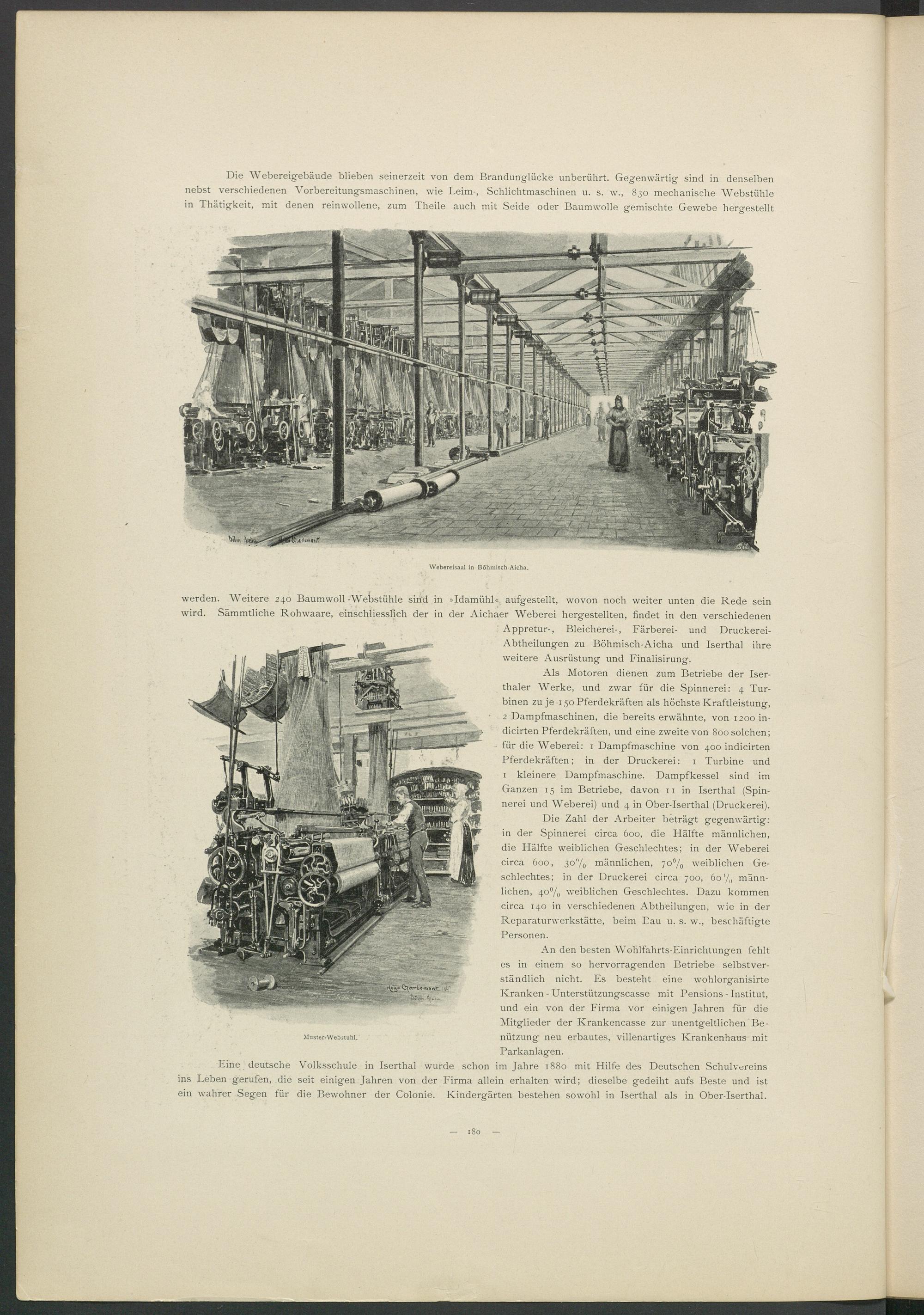 Als Motoren dienen zum Betriebe der Iserthaler Werke, und zwar für die Spinnerei: 4 Turbinen zu je 150 Pferdekräften als höchste Kraftleistung, 2 Dampfmaschinen, die bereits erwähnte, von 1200 in- dicirten Pferdekräften, und eine zweite von 800 solchen; für die Weberei: 1 Dampfmaschine von 400 indicirten Pferdekräften; in der Druckerei: 1 Turbine und 1 kleinere Dampfmaschine. Dampfkessel sind im Ganzen 15 im Betriebe, davon 11 in Iserthai (Spinnerei und Weberei) und 4 in Ober-Iserthal (Druckerei).