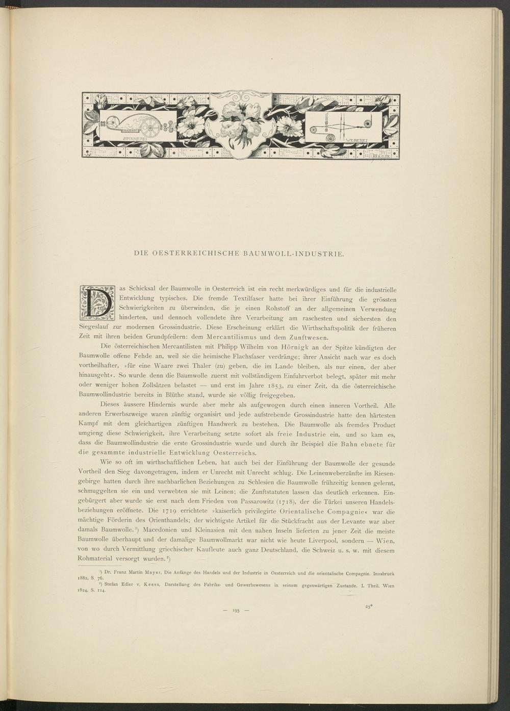 Die österreichischen Mercantilisten mit Philipp Wilhelm von Hörnigk an der Spitze kündigten der Baumwolle offene Fehde an, weil sie die heimische Flachsfaser verdränge; ihrer Ansicht nach war es doch vortheilhafter, »für eine Waare zwei Thaler (zu) geben, die im Lande bleiben, als nur einen, der aber hinausgeht«. So wurde denn die Baumwolle zuerst mit vollständigem Einfuhrverbot belegt, später mit mehr oder weniger hohen Zollsätzen belastet — und erst im Jahre 1853, zu einer Zeit, da die österreichische Baumwollindustrie bereits in Blüthe stand, wurde sie völlig freigegeben.