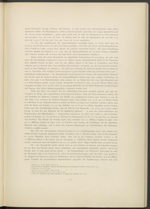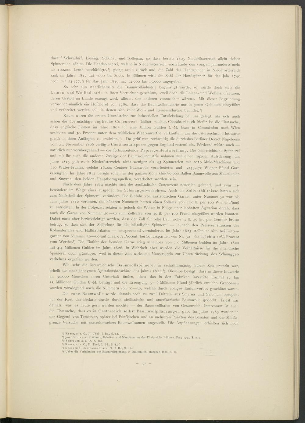 So sehr nun staatlicherseits die Baumwollindustrie begünstigt wurde, so wurde doch stets die Leinen- und Wollindustrie in ihren Vorrechten geschützt, »weil doch die Leinen- und Wollmanufacturen, deren Urstoff im Lande erzeugt wird, allezeit den anderen vorzuziehen wären«. Mit dieser Begründung verordnet nämlich ein Hofdecret von 1789, dass die Baumwollindustrie nur in jenen Gebieten eingeführt und verbreitet werden soll, in denen sich keineWoll- und Leinenindustrie befindet. 3 )