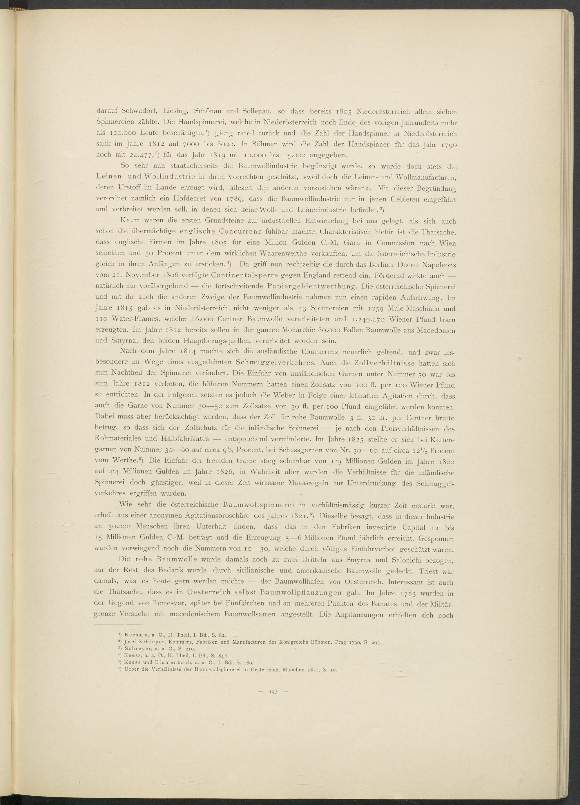 Wie sehr die österreichische Baumwollspinnerei in verhältnismässig kurzer Zeit erstarkt war, erhellt aus einer anonymen Agitationsbroschüre des Jahres 1821. 8 ) Dieselbe besagt, dass in dieser Industrie an 30.000 Menschen ihren Unterhalt finden, dass das in den Fabriken investirte Capital 12 bis 15 Millionen Gulden C.-M. beträgt und die Erzeugung 5—6 Millionen Pfund jährlich erreicht. Gesponnen wurden vorwiegend noch die Nummern von 10—30, welche durch völliges Einfuhrverbot geschützt waren.