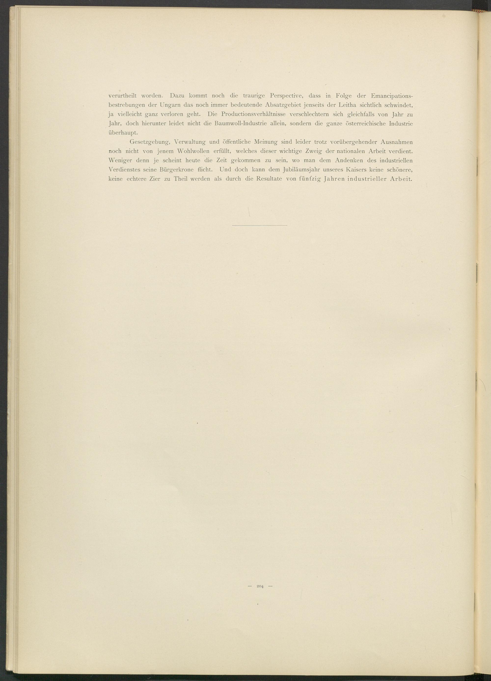 verurtheilt worden. Dazu kommt noch die traurige Perspective, dass in Folge der Emancipations- bestrebungen der Ungarn das noch immer bedeutende Absatzgebiet jenseits der Leitha sichtlich schwindet, ja vielleicht ganz verloren geht. Die Productionsverhältnisse verschlechtern sich gleichfalls von Jahr zu Jahr, doch hierunter leidet nicht die Baumwoll-Industrie allein, sondern die ganze österreichische Industrie überhaupt.