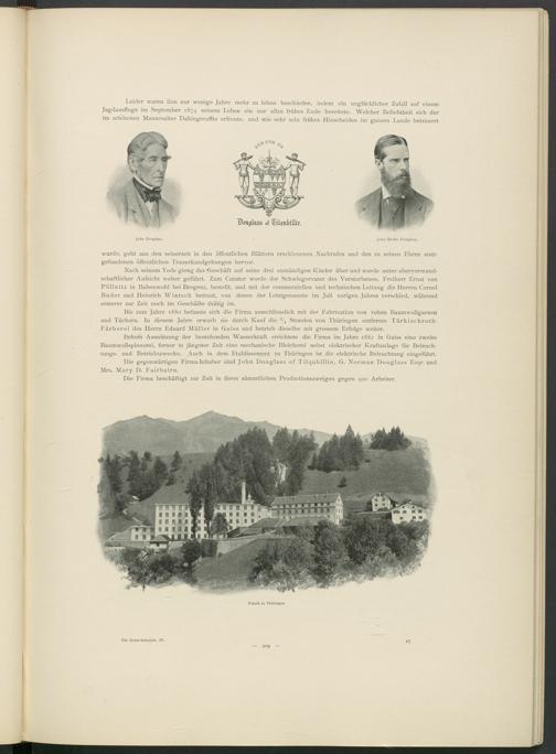 Bis zum Jahre 1880 befasste sich die Firma ausschliesslich mit der Fabrication von rohen Baumwollgarnen und Tüchern. In diesem Jahre erwarb sie durch Kauf die 3 / 4 Stunden von Thüringen entfernte Türkischroth- Färberei des Herrn Eduard Müller in Gaiss und betrieb dieselbe mit grossem Erfolge weiter.