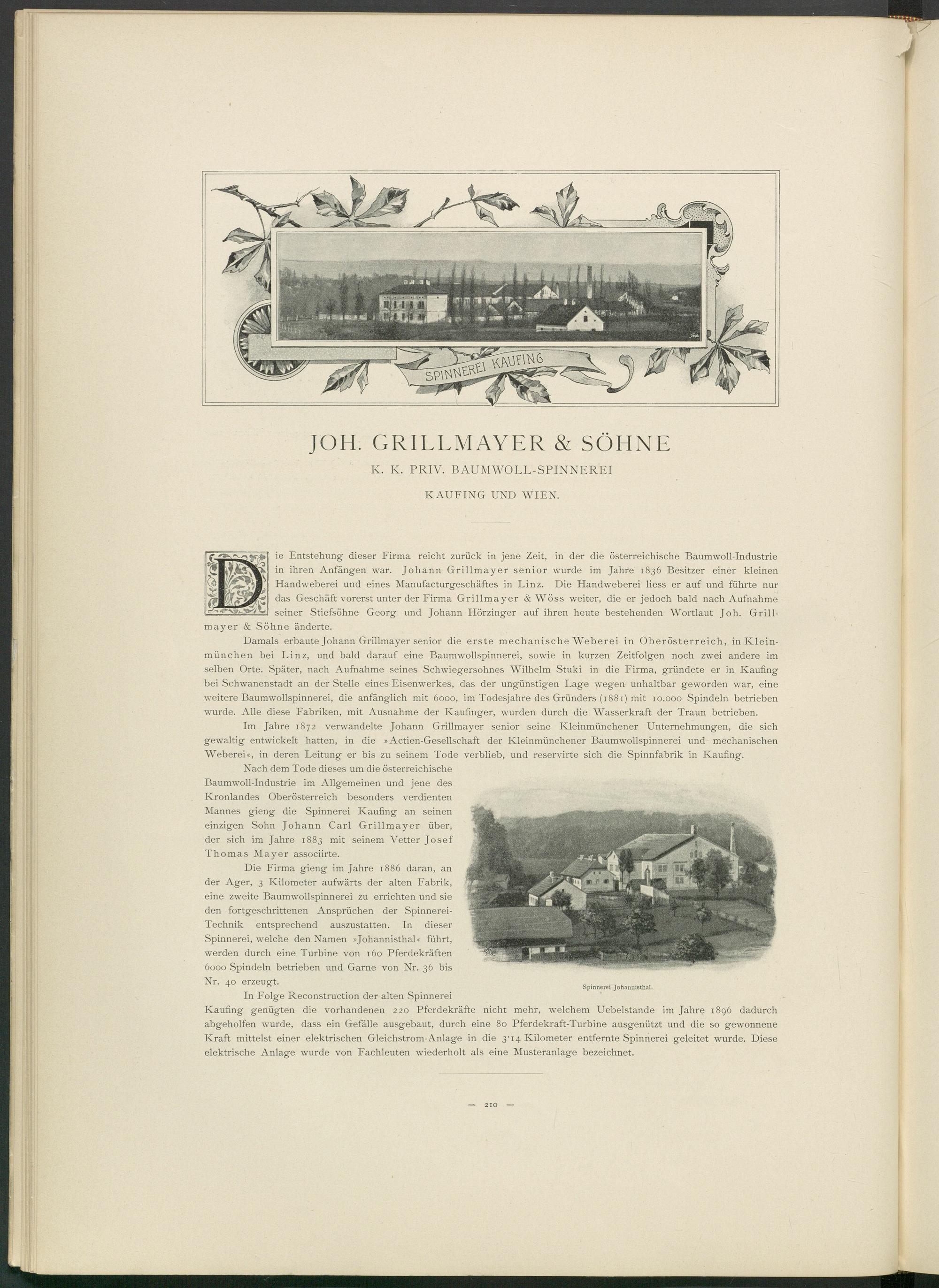 Nach dem Tode dieses um die österreichische Baumwoll-Industrie im Allgemeinen und jene des Kronlandes Oberösterreich besonders verdienten Mannes gieng die Spinnerei Kaufing an seinen einzigen Sohn Johann Carl Grillmayer über, der sich im Jahre 1883 mit seinem Vetter Josef Thomas Mayer associirte.