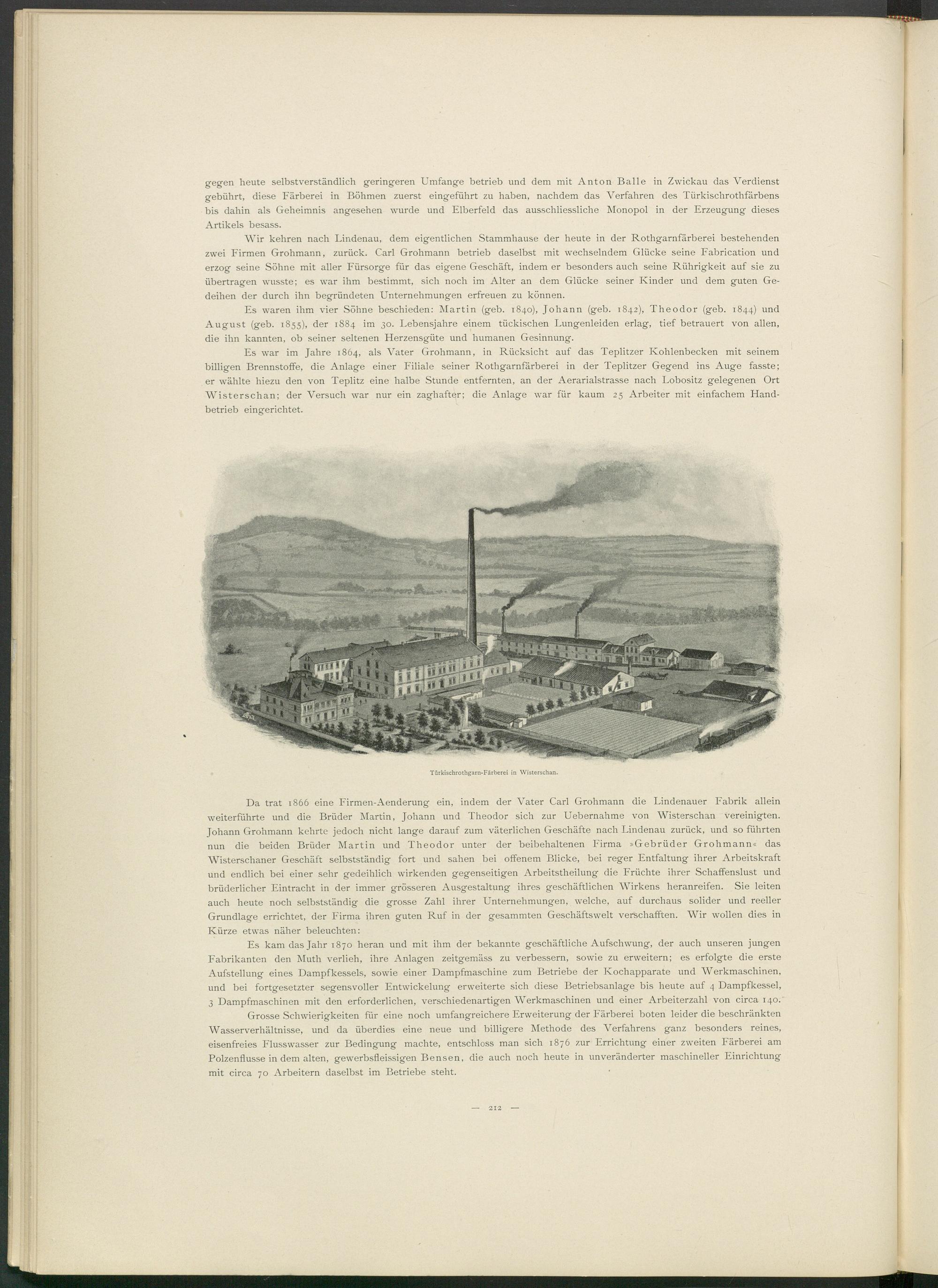 Da trat 1866 eine Firmen-Aenderung ein, indem der Vater Carl Grohmann die Lindenauer Fabrik allein weiterführte und die Brüder Martin, Johann und Theodor sich zur Uebernahme von Wisterschan vereinigten. Johann Grohmann kehrte jedoch nicht lange darauf zum väterlichen Geschäfte nach Lindenau zurück, und so führten nun die beiden Brüder Martin und Theodor unter der beibehaltenen Firma »Gebrüder Grohmann« das Wisterschaner Geschäft selbstständig fort und sahen bei offenem Blicke, bei reger Entfaltung ihrer Arbeitskraft und endlich bei einer sehr gedeihlich wirkenden gegenseitigen Arbeitstheilung die Früchte ihrer Schaffenslust und brüderlicher Eintracht in der immer grösseren Ausgestaltung ihres geschäftlichen AVirkens heranreifen. Sie leiten auch heute noch selbstständig die grosse Zahl ihrer Unternehmungen, welche, auf durchaus solider und reeller Grundlage errichtet, der Firma ihren guten Ruf in der gesammten Geschäftswelt verschafften. Wir wollen dies in Kürze etwas näher beleuchten: