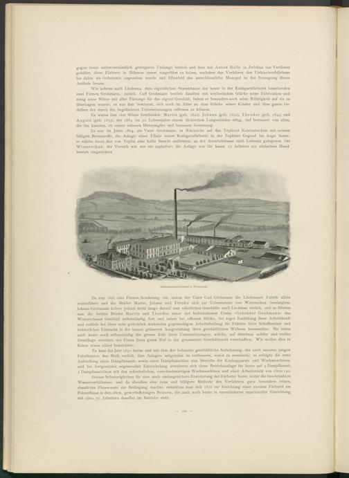 Grosse Schwierigkeiten für eine noch umfangreichere Erweiterung der Färberei boten leider die beschränkten Wasserverhältnisse, und da überdies eine neue und billigere Methode des A^erfahrens ganz besonders reines, eisenfreies Flusswasser zur Bedingung machte, entschloss man sich 1876 zur Errichtung einer zweiten Färberei am Polzenflusse in dem alten, gewerbsfleissigen Bensen, die auch noch heute in unveränderter maschineller Einrichtung mit circa 70 Arbeitern daselbst im Betriebe steht.