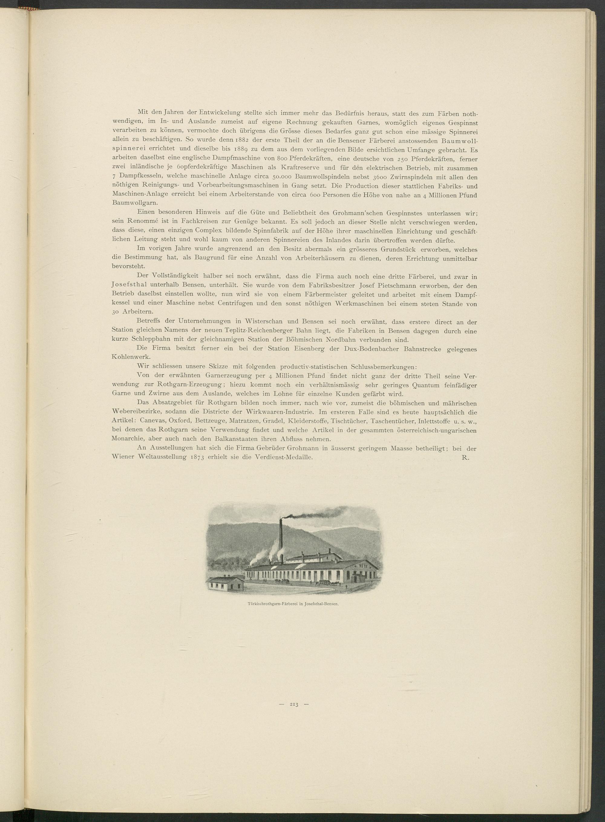Mit den Jahren der Entwickelung stellte sich immer mehr das Bedürfnis heraus, statt des zum Färben noth- wendigen, im In- und Auslande zumeist auf eigene Rechnung gekauften Garnes, womöglich eigenes Gespinnst verarbeiten zu können, vermochte doch übrigens die Grösse dieses Bedarfes ganz gut schon eine massige Spinnerei allein zu beschäftigen. So wurde denn 1882 der erste Theil der an die Bensener Färberei anstossenden Baumwollspinnerei errichtet und dieselbe bis 1889 zu dem aus dem vorliegenden Bilde ersichtlichen Umfange gebracht. Es arbeiten daselbst eine englische Dampfmaschine von 800 Pferdekräften, eine deutsche von 250 Pferdekräften, ferner zwei inländische je öopferdekräftige Maschinen als Kraftreserve und für den elektrischen Betrieb, mit zusammen 7 Dampfkesseln, welche maschinelle Anlage circa 50.000 Baumwollspindeln nebst 3600 Zwirnspindeln mit allen den nöthigen Reinigungs- und Vorbearbeitungsmaschinen in Gang setzt. Die Production dieser stattlichen Fabriks- und Maschinen-Anlage erreicht bei einem Arbeiterstande von circa 600 Personen die Höhe von nahe an 4 Millionen Pfund Baumwollgarn.