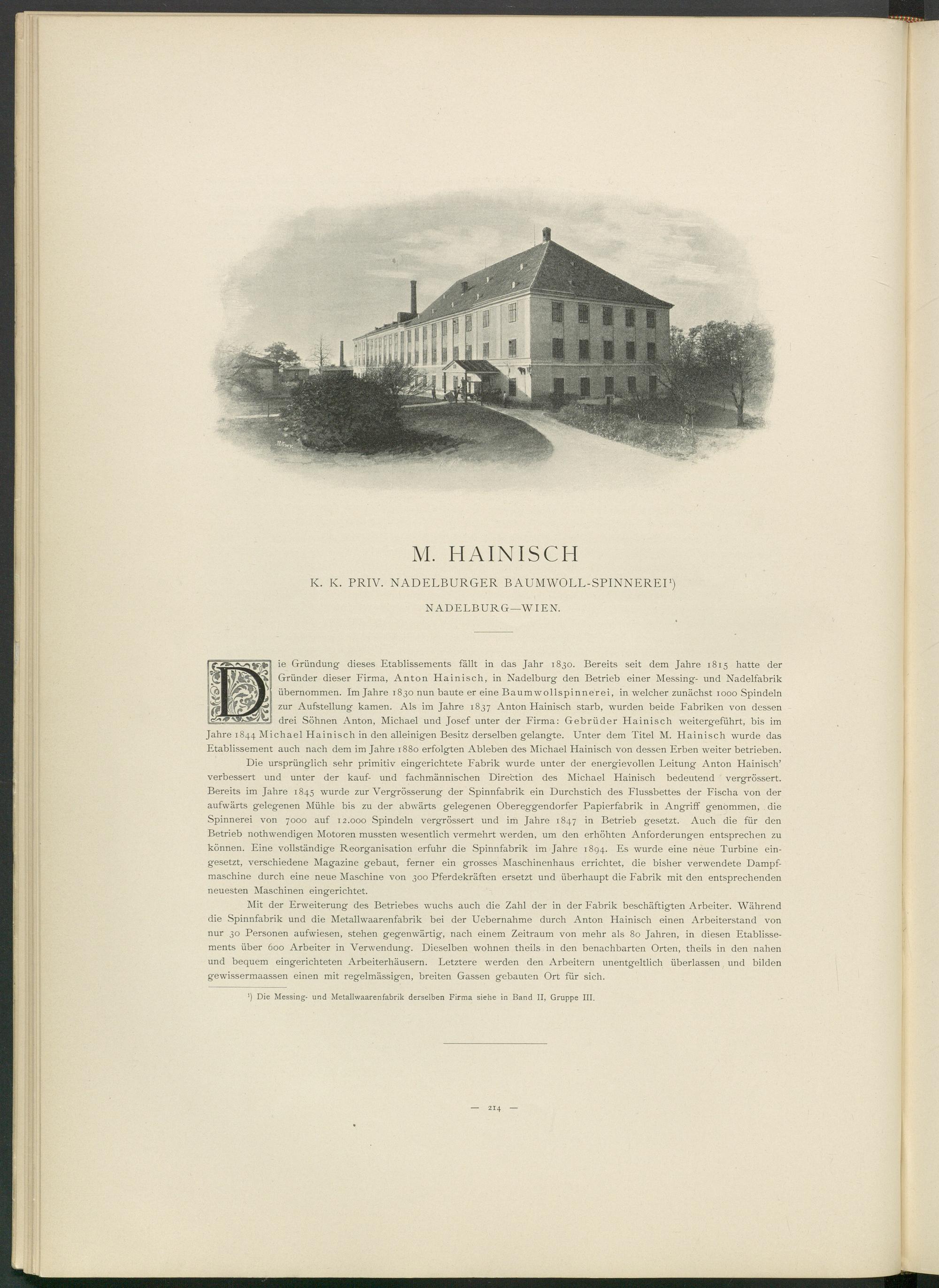 I ie Gründung dieses Etablissements fällt in das Jahr 1830. Bereits seit dem Jahre 1815 hatte der Gründer dieser Firma, Anton Hainisch, in Nadelburg den Betrieb einer Messing- und Nadelfabrik übernommen. Im Jahre 1830 nun baute er eine Baumwollspinnerei, in welcher zunächst 1000 Spindeln zur Aufstellung kamen. Als im Jahre 1837 Anton Hainisch starb, wurden beide Fabriken von dessen drei Söhnen Anton, Michael und Josef unter der Firma: Gebrüder Hainisch weitergeführt, bis im Jahre 1844 Michael Hainisch in den alleinigen Besitz derselben gelangte. Unter dem Titel M. Hainisch wurde das Etablissement auch nach dem im Jahre 1880 erfolgten Ableben des Michael Hainisch von dessen Erben weiter betrieben.