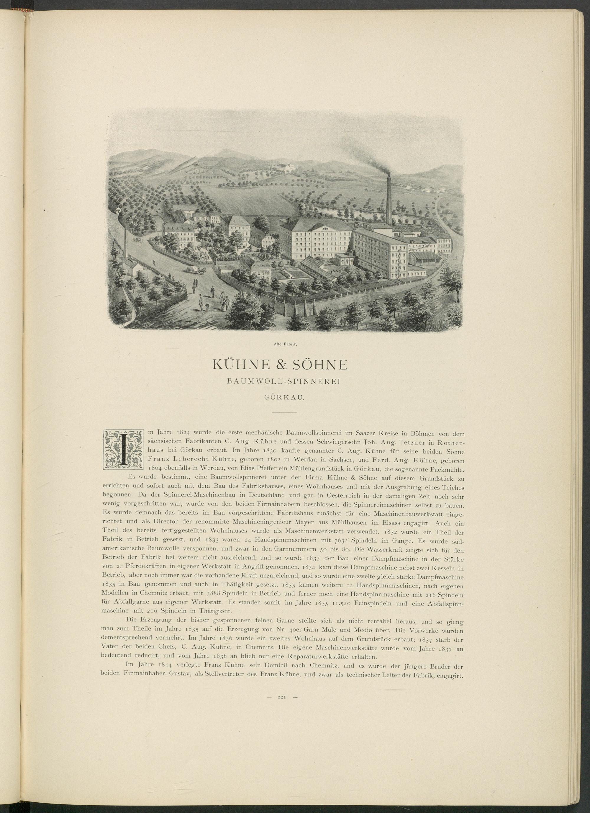 Es wurde bestimmt, eine Baumwollspinnerei unter der Firma Kühne & Söhne auf diesem Grundstück zu errichten und sofort auch mit dem Bau des Fabrikshauses, eines Wohnhauses und mit der Ausgrabung eines Teiches begonnen. Da der Spinnerei-Maschinenbau in Deutschland und gar in Oesterreich in der damaligen Zeit noch sehr wenig vorgeschritten war, wurde von den beiden Firmainhabern beschlossen, die Spinnereimaschinen selbst zu bauen. Es wurde demnach das bereits im Bau vorgeschrittene Fabrikshaus zunächst für eine Maschinenbauwerkstatt eingerichtet und als Director der renommirte Maschineningenieur Mayer aus Mühlhausen im Eisass engagirt. Auch ein Theil des bereits fertiggestellten Wohnhauses wurde als Maschinenwerkstatt verwendet. 1832 wurde ein Theil der Fabrik in Betrieb gesetzt, und 1833 waren 24 Handspinnmaschinen mit 7632' Spindeln im Gange. Es wurde südamerikanische Baumwolle versponnen, und zwar in den Garnnummern 50 bis 80. Die Wasserkraft zeigte sich für den Betrieb der Fabrik bei weitem nicht ausreichend, und so wurde 1833 der Bau einer Dampfmaschine in der Stärke von 24 Pferdekräften in eigener Werkstatt in Angriff genommen. 1834 kam diese Dampfmaschine nebst zwei Kesseln in Betrieb, aber noch immer war die vorhandene Kraft unzureichend, und so wurde eine zweite gleich starke Dampfmaschine 1835 in Bau genommen und auch in Thätigkeit gesetzt. 1835 kamen weitere 12 Handspinnmaschinen, nach eig-enen Modellen in Chemnitz erbaut, mit 3888 Spindeln in Betrieb und ferner noch eine Handspinnmaschine mit 216 Spindeln für Abfallgarne aus eigener Werkstatt. Es standen somit im Jahre 1835 11-520 Feinspindeln und eine Abfallspinnmaschine mit 216 Spindeln in Thätigkeit.