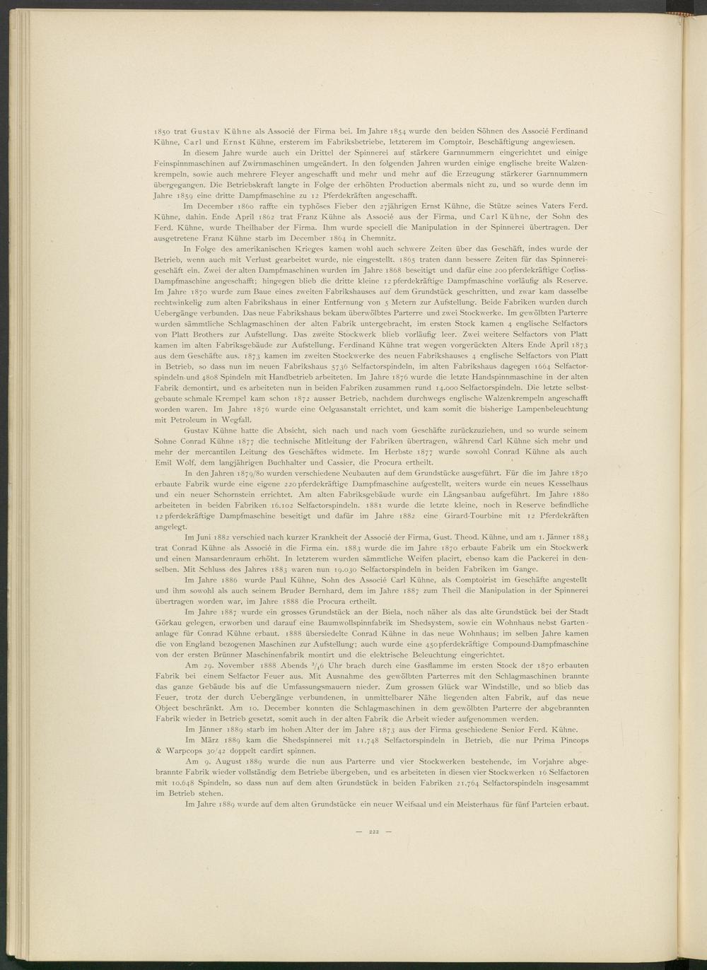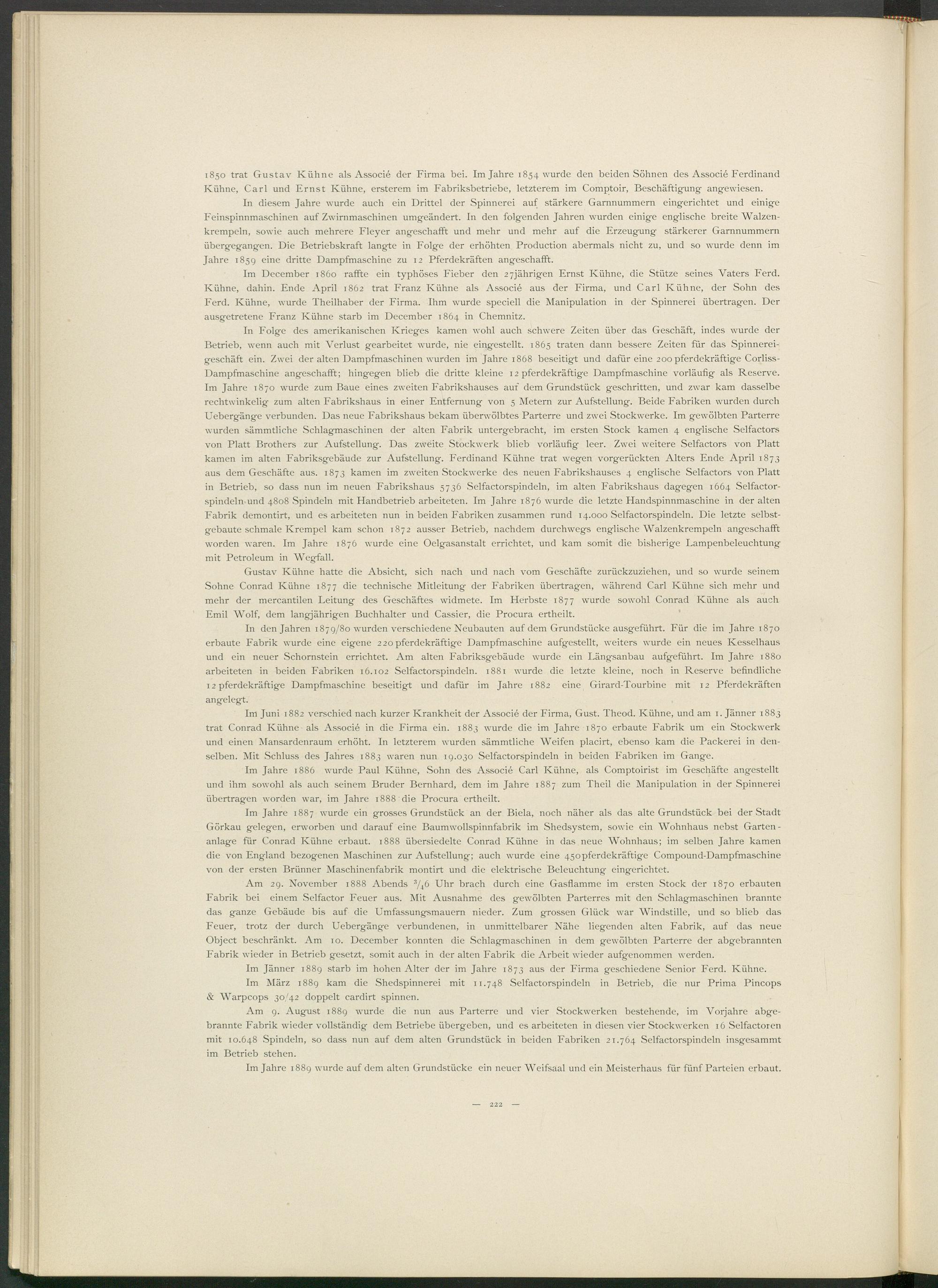 Im Juni 1882 verschied nach kurzer Krankheit der Associé der Firma, Gust. Theod. Kühne, und am 1. Jänner 1883 trat Conrad Kühne als Associé in die Firma ein. 1883 wurde die im Jahre 1870 erbaute Fabrik um ein Stockwerk und einen Mansardenraum erhöht. In letzterem wurden sämmtliche Weifen placirt, ebenso kam die Packerei in denselben. Mit Schluss des Jahres 1883 waren nun 19.030 Selfactorspindeln in beiden Fabriken im Gange.