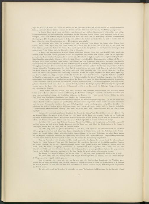 In Folge des amerikanischen Krieges kamen wohl auch schwere Zeiten über das Geschäft, indes wurde der Betrieb, wenn auch mit Verlust gearbeitet wurde, nie eingestellt. 1865 traten dann bessere Zeiten für das Spinnereigeschäft ein. Zwei der alten Dampfmaschinen wurden im Jahre 1868 beseitigt und dafür eine 200 pferdekräftige Corliss- Dampfmaschine angeschafft ; hingegen blieb die dritte kleine 12 pferdekräftige Dampfmaschine vorläufig als Reserve. Im Jahre 1870 wurde zum Baue eines zweiten Fabrikshauses auf dem Grundstück g-eschritten, und zwar kam dasselbe rechtwinkelig zum alten Fabrikshaus in einer Entfernung von 5 Metern zur Aufstellung. Beide Fabriken wurden durch Uebergänge verbunden. Das neue Fabrikshaus bekam überwölbtes Parterre und zwei Stockwerke. Im gewölbten Parterre wurden sämmtliche Schlagmaschinen der alten Fabrik untergebracht, im ersten Stock kamen 4 englische Selfactors von Platt Brothers zur Aufstellung. Das zweite Stockwerk blieb vorläufig leer. Zwei weitere Selfactors von Platt kamen im alten Fabriksgebäude zur Aufstellung. Ferdinand Kühne trat wegen vorgerückten Alters Ende April 1873 aus dem Geschäfte aus. 1873 kamen im zweiten Stockwerke des neuen Fabrikshauses 4 englische Selfactors von Platt in Betrieb, so dass nun im neuen Fabrikshaus 5736 Selfactorspindeln, im alten Fabrikshaus dagegen 1664 Selfactor- spindeln und 4808 Spindeln mit Handbetrieb arbeiteten. Im Jahre 1876 wurde die letzte Handspinnmaschine in der alten Fabrik demontirt, und es arbeiteten nun in beiden Fabriken zusammen rund 14.000 Selfactorspindeln. Die letzte selbstgebaute schmale Krempel kam schon 1872 ausser Betrieb, nachdem durchwegs englische Walzenkrempeln angeschafft worden waren. Im Jahre 1876 wurde eine Oelgasanstalt errichtet, und kam somit die bisherige Lampenbeleuchtung mit Petroleum in Wegfall.