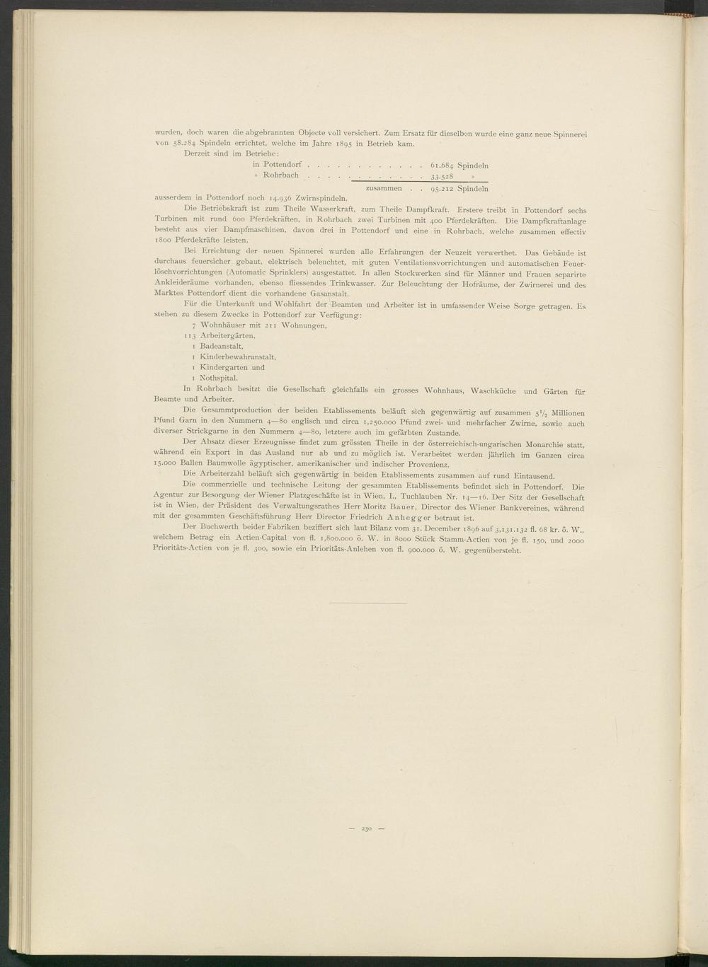 Der Buchwerth beider Fabriken beziffert sich laut Bilanz vom 31. December 1896 auf 3,131.132 fl. 68 kr. ö. W., welchem Betrag ein Actien-Capital von fl. 1,800.000 ö. W. in 8000 Stück Stamm-Actien von je fl. 150, und 2000 Prioritäts-Actien von je fl. 300, sowie ein Prioritäts-Anlehen von fl. 900.000 ö. W. gegenübersteht.
