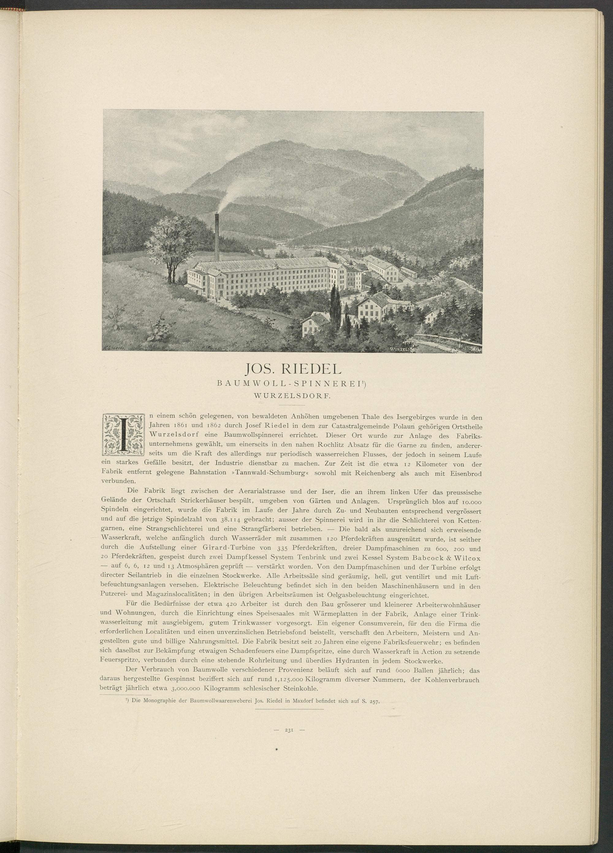 n einem schön gelegenen, von bewaldeten Anhöhen umgebenen Thale des Isergebirges wurde in den Jahren 1861 und 1862 durch Josef Riedel in dem zur Catastralgemeinde Polaun gehörigen Ortstheile Wurzelsdorf eine Baumwollspinnerei errichtet. Dieser Ort wurde zur Anlage des Fabriksunternehmens gewählt, um einerseits in den nahen Rochlitz Absatz für die Garne zu finden, andererseits um die Kraft des allerdings nur periodisch wasserreichen Flusses, der jedoch in seinem Laufe ein starkes Gefalle besitzt, der Industrie dienstbar zu machen. Zur Zeit ist die etwa 12 Kilometer von der babrik entfernt gelegene Bahnstation »Tannwald-Schumburg« sowohl mit Reichenberg als auch mit Eisenbrod verbunden.