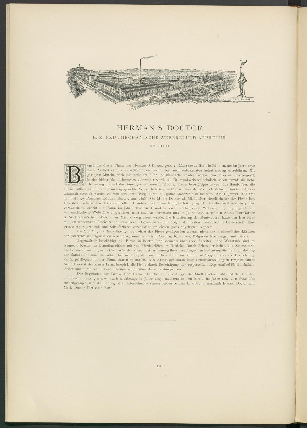 egründer dieser Firma war Herman S. Doctor, geb. 31. Mai 1820 zu Hofic in Böhmen, der im Jahre 1850 nach Nachod kam, um daselbst einen bisher dort noch unbekannten Industriezweig einzuführen. Mit geringen Mitteln, doch mit rastlosem Eifer und nicht erlahmender Energie, machte er in einer Gegend, in der bisher blos Leinengarn verarbeitet ward, die Baumwollweberei heimisch, schon damals die hohe Bedeutung dieses Industriezweiges erkennend. Jahraus, jahrein beschäftigte er 500—600 Handweber, die allwöchentlich die in ihrer Behausung gewebte Waare lieferten, welche in einer damals noch kleinen primitiven Appreturanstalt veredelt wurde, um von dort ihren Weg durch die ganze Monarchie zu nehmen. Am 1. Jänner 1882 trat der bisherige Procurist Eduard Doctor, am 1. Juli 1886 Moriz Doctor als öffentlicher Gesellschafter der Firma bei. Das stete Fortschreiten des maschinellen Betriebes liess einen baldigen Rückgang der Handweberei erwarten; dies voraussehend, schritt die Firma im Jahre 1882 zur Gründung einer mechanischen Weberei, die, ursprünglich auf 500 mechanische Webstühle eingerichtet, nach und nach erweitert und im Jahre 1895 durch den Ankauf der Gärber & Sindermann’schen Weberei in Nachod vergrössert wurde. Die Erweiterung der Buntweberei hatte den Bau einer mit den modernsten Einrichtungen versehenen Copsfärberei zur Folge, der ersten dieser Art in Oesterreich. Eine grosse Appreturanstalt und Stückfärberei vervollständigte diesen gross angelegten Apparat.