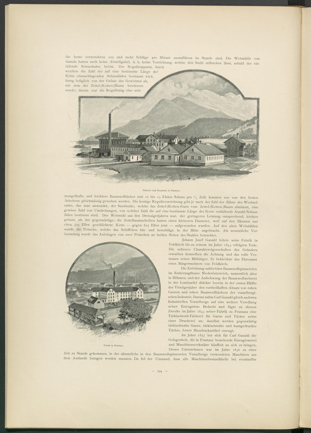 Die Errichtung zahlreicher Baumwollspinnereien im Erzherzogthume Niederösterreich, namentlich aber in Böhmen, und der Aufschwung der Baumwollweberei in der Lombardei drückte bereits in der ersten Hälfte der Vierzigerjahre den vortheilhaften Absatz von rohen Garnen und rohen Baumwolltüchern der vorarlbergi- schenIndustrie. Darum nahm Carl Ganahl gleich anderen Industriellen Vorarlbergs auf eine weitere Veredlung seiner Erzeugnisse Bedacht und fügte zu diesem Zwecke im Jahre 1843 seiner Fabrik zu Frastanz eine Türkischroth-Färberei für Garne und Tücher nebst einer Druckerei an; daselbst werden gegenwärtig türkischrothe Garne, türkischrothe und buntgedruckte Tücher, ferner Blaudruckartikel erzeugt.