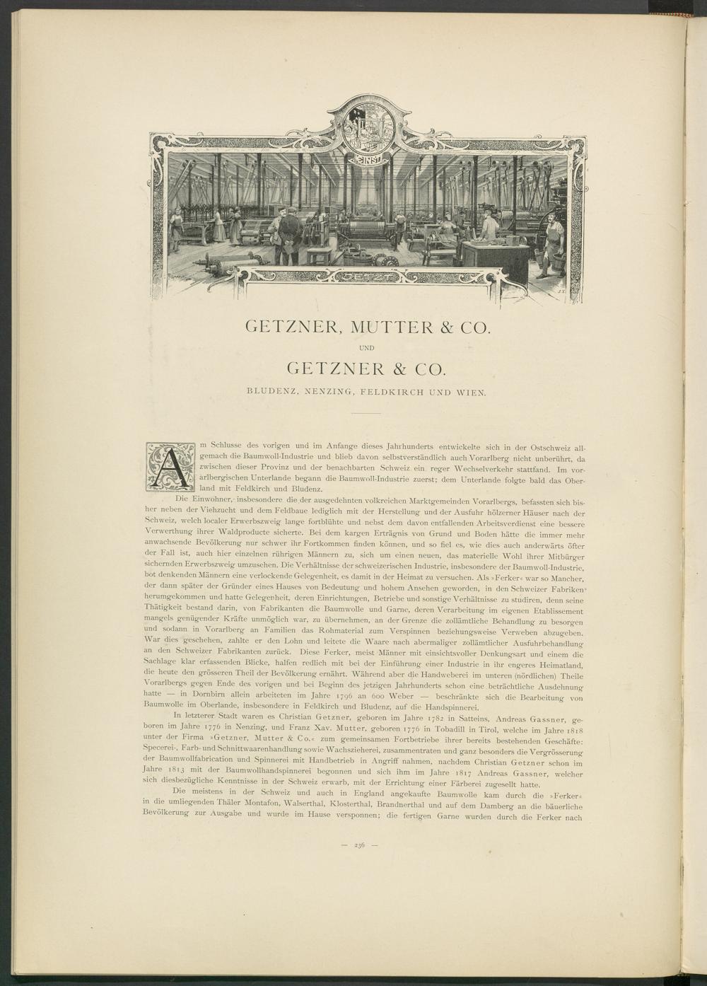 In letzterer Stadt waren es Christian Getzner, geboren im Jahre 1782 in Satteins, Andreas Gassner, geboren im Jahre 1776 in Nenzing, und Franz Xav. Mutter, geboren 1776 in Tobadill in Tirol, welche im Jahre 1818 unter der Firma »Getzner, Mutter & Co.« zum gemeinsamen Fortbetriebe ihrer bereits bestehenden Geschäfte: Specerei-, Färb-und Schnittwaarenhandlung sowie Wachszieherei, zusammentraten und ganz besonders die Vergrösserung der Baumwollfabrication und Spinnerei mit Handbetrieb in Angriff nahmen, nachdem Christian Getzner schon im Jahre 1813 mit der Baurmvollhandspinnerei begonnen und sich ihm im Jahre 1817 Andreas Gassner, welcher sich diesbezügliche Kenntnisse in der Schweiz erwarb, mit der Errichtung einer Färberei zugesellt hatte.