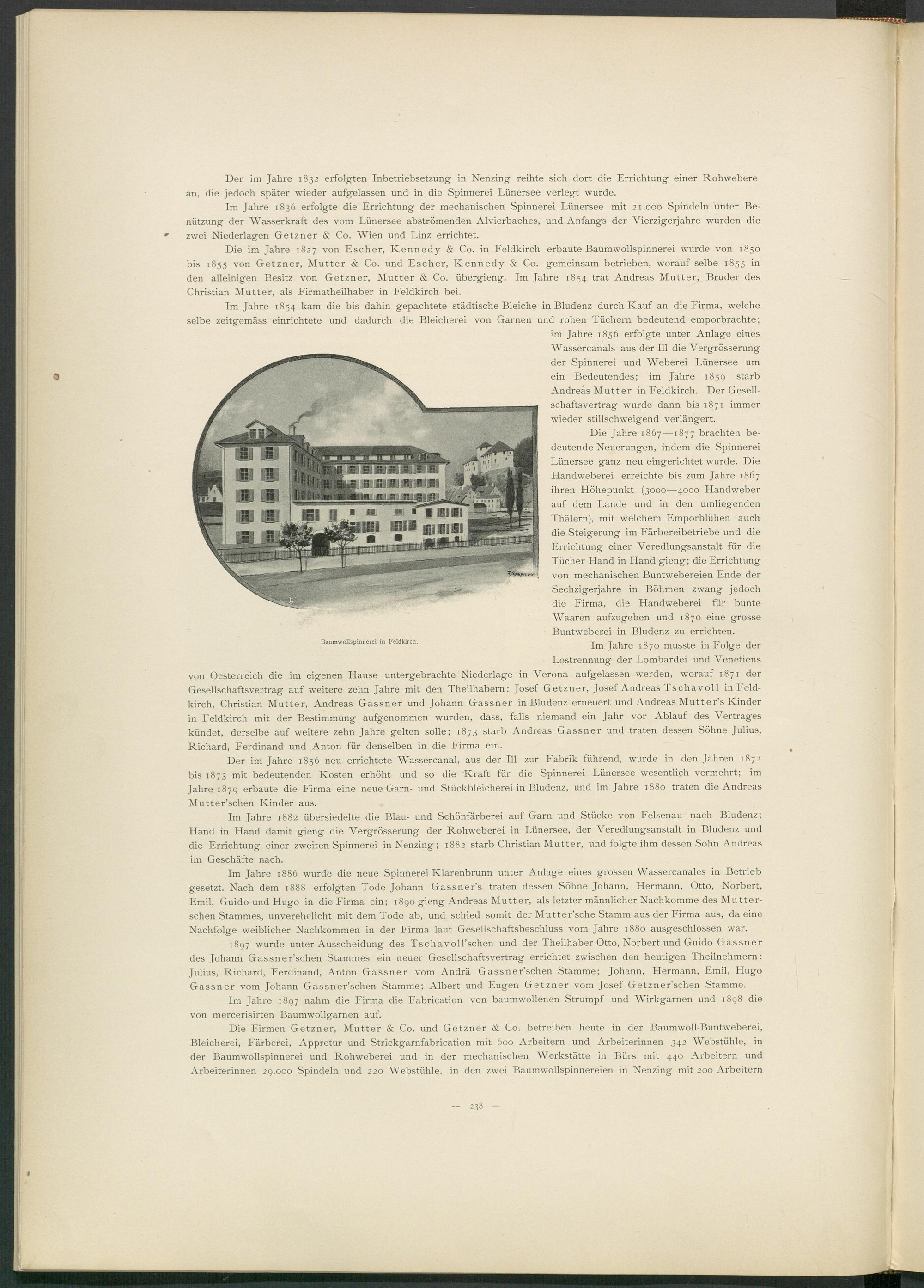 Die Firmen Getzner, Mutter & Co. und Getzner & Co. betreiben heute in der Baumwoll-Buntweberei, Bleicherei, Färberei, Appretur und Strickgarnfabrication mit 600 Arbeitern und Arbeiterinnen 342 Webstühle, in der Baumwollspinnerei und Rohweberei und in der mechanischen Werkstätte in Bürs mit 440 Arbeitern und x\rbeiterinnen 29.000 Spindeln und 220 Webstühle, in den zwei Baumwollspinnereien in Nenzing mit 200 Arbeitern