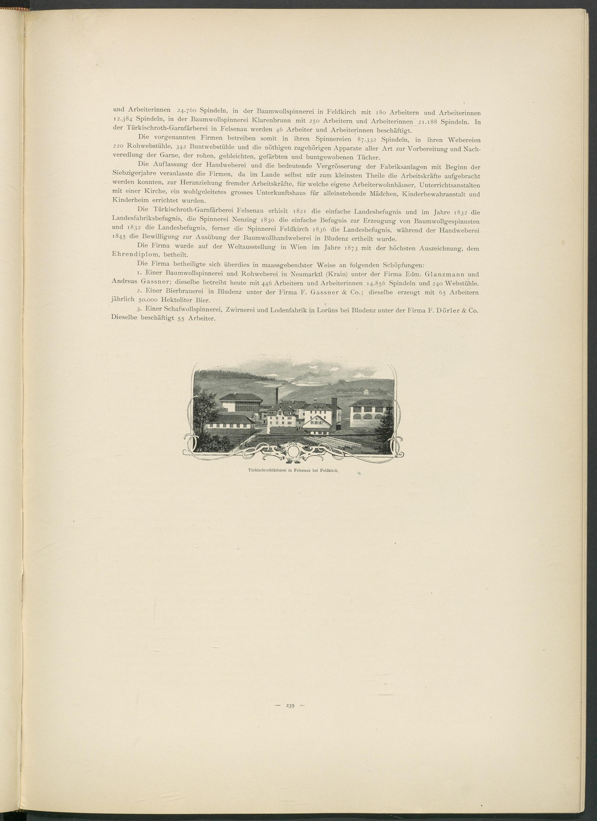 und Arbeiterinnen 24.760 Spindeln, in der Baumwollspinnerei in Feldkirch mit 180 Arbeitern und Arbeiterinnen 12.384 Spindeln, in der Baumwollspinnerei Klarenbrunn mit 250 Arbeitern und Arbeiterinnen 21.188 Spindeln. In der Türkischroth-Garnfärberei in Felsenau werden 46 Arbeiter und Arbeiterinnen beschäftigt.