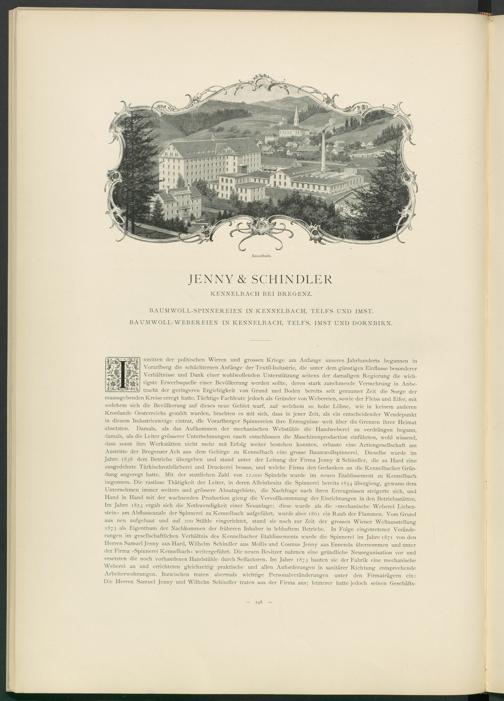 nmitten der politischen Wirren und grossen Kriege am Anfänge unseres Jahrhunderts begannen in Vorarlberg die schüchternen Anfänge der Textil-Industrie, die unter dem günstigen Einflüsse besonderer Verhältnisse und Dank einer wohlwollenden Unterstützung seitens der damaligen Regierung die wichtigste Erwerbsquelle einer Bevölkerung werden sollte, deren stark zunehmende Vermehrung in Anbetracht der geringeren Ergiebigkeit von Grund und Boden bereits seit geraumer Zeit die Sorge der maassgebenden Kreise erregt hatte. Tüchtige Fachleute jedoch als Gründer von Webereien, sowie der Fleiss und Eifer, mit welchem sich die Bevölkerung auf dieses neue Gebiet warf, auf welchem so hohe Löhne, wie in keinem anderen Kronlande Oesterreichs gezahlt wurden, brachten es mit sich, dass in jener Zeit, als ein entscheidender Wendepunkt in diesem Industriezweige eintrat, die Vorarlberger Spinnereien ihre Erzeugnisse weit über die Grenzen ihrer Heimat absetzten. Damals, als das Aufkommen der mechanischen Webstühle die' Handweberei zu verdrängen begann, damals, als die Leiter grösserer Unternehmungen rasch entschlossen die Maschinenproduction einführten, wohl wissend, dass sonst ihre Werkstätten nicht mehr mit Erfolg weiter bestehen konnten, erbaute eine Actiengesellschaft am Austritte der Bregenzer Ach aus dem Gebirge zu Kennelbach eine grosse Baumwollspinnerei. Dieselbe wurde im Jahre 1838 dem Betriebe übergeben und stand unter der Leitung der Firma Jenny & Schindler, die zu Hard eine ausgedehnte Türkischrothfärberei und Druckerei besass, und welche Firma den Gedanken an die Kennelbacher Gründung angeregt hatte. Mit der stattlichen Zahl von 22.000 Spindeln wurde im neuen Etablissement zu Kennelbach begonnen. Die rastlose Thätigkeit der Leiter, in deren Alleinbesitz die Spinnerei bereits 1854 übergieng, gewann dem Unternehmen immer weitere und grössere Absatzgebiete, die Nachfrage nach ihren Erzeugnissen steigerte sich, und Hand in Hand mit der wachsenden Production gieng die Vervollkommnung der Einrichtungen in den Betriebsstätten. Im Jahre 1853 ergab sich die Nothwendigkeit einer Neuanlage; diese wurde als die »mechanische Weberei Liebenstein« am Abflusscanale der Spinnerei zu Kennelbach aufgeführt, wurde aber 1861 ein Raub der Flammen. Vom Grund aus neu aufgebaut und auf 200 Stühle eingerichtet, stand sie noch zur Zeit der grossen Wiener Weltausstellung 1873 als Eigenthum der Nachkommen der früheren Inhaber in lebhaftem Betriebe. In Folge eingetretener Veränderungen im gesellschaftlichen Verhältnis des Kennelbacher Etablissements wurde die Spinnerei im Jahre 1871 von den Herren Samuel Jenny aus Hard, Wilhelm Schindler aus Mollis und Cosmus Jenny aus Ennenda übernommen und unter der Firma »Spinnerei Kennelbach« weitergeführt. Die neuen Besitzer nahmen eine gründliche Neuorganisation vor und ersetzten die noch vorhandenen Handstühle durch Selfactoren. Im Jahre 1873 bauten sie der Fabrik eine mechanische Weberei an und errichteten gleichzeitig praktische und allen Anforderungen in sanitärer Richtung entsprechende Arbeiterwohnungen. Inzwischen traten abermals wichtige Personalveränderungen unter den Firmaträgern ein: Die Herren Samuel Jenny und Wilhelm Schindler traten aus der Firma aus; letzterer hatte jedoch seinen Geschäfts-