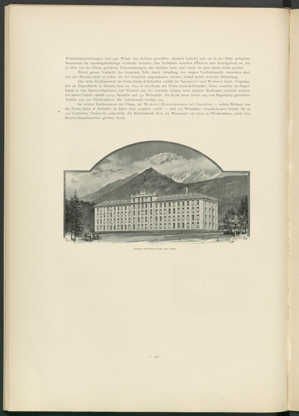 Das dritte Etablissement der Firma Jenny & Schindler enthält die Spinnerei und Weberei Imst. Ursprünglich als Papierfabrik in Betrieb, kam sie 1892 in den Besitz der Firma Jenny & Schindler. Diese wandelte die Papierfabrik in eine Baumwollspinnerei und Weberei um, bei welchem Anlasse noch mehrere Neubauten errichtet wurden. Die Imster Fabrik enthält 14.844 Spindeln und 341 Webstühle. Die Kraft hiezu liefert eine vom Bigerbache getriebene Turbine von 350 Pferdestärken. Die Arbeiterzahl beträgt 254.