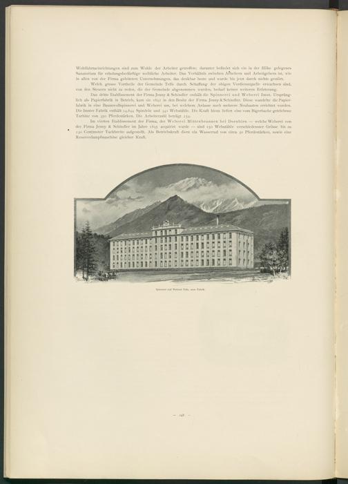 Im vierten Etablissement der Firma, der Weberei Mittenbrunnen bei Dornbirn — welche Weberei von der.Firma Jenny & Schindler im Jahre 1895 acquirirt wurde — sind 150 Webstühle verschiedenster Grösse bis zu 230 Centimeter Tuchbreite aufgestellt. Als Betriebskraft dient ein Wasserrad von circa 30 Pferdestärken, sowie eine Reservedampfmaschine gleicher Kraft.