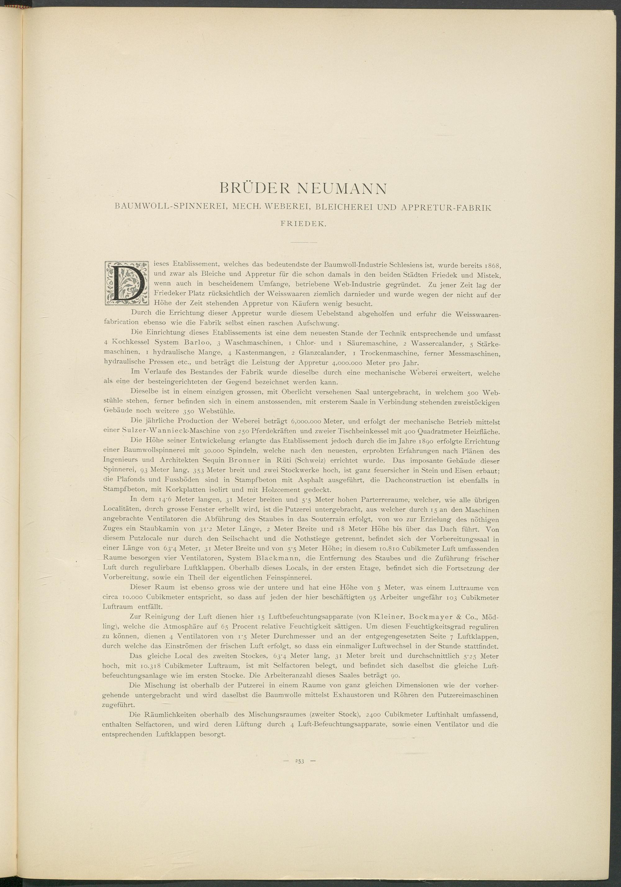 Die Höhe seiner Entwickelung erlangte das Etablissement jedoch durch die im Jahre 1890 erfolgte Errichtung einer Baumwollspinnerei mit 30.000 Spindeln, welche nach den neuesten, erprobten Erfahrungen nach Plänen des Ingenieurs und Architekten Sequin Bronner in Rüti (Schweiz) errichtet wurde. Das imposante Gebäude dieser Spinnerei, 93 Meter lang, 353 Meter breit und zwei Stockwerke hoch, ist ganz feuersicher in Stein und Eisen erbaut; die Plafonds und Fussböden sind in Stampfbeton mit Asphalt ausgeführt, die Dachconstruction ist ebenfalls in Stampfbeton, mit Korkplatten isolirt und mit Holzcement gedeckt.